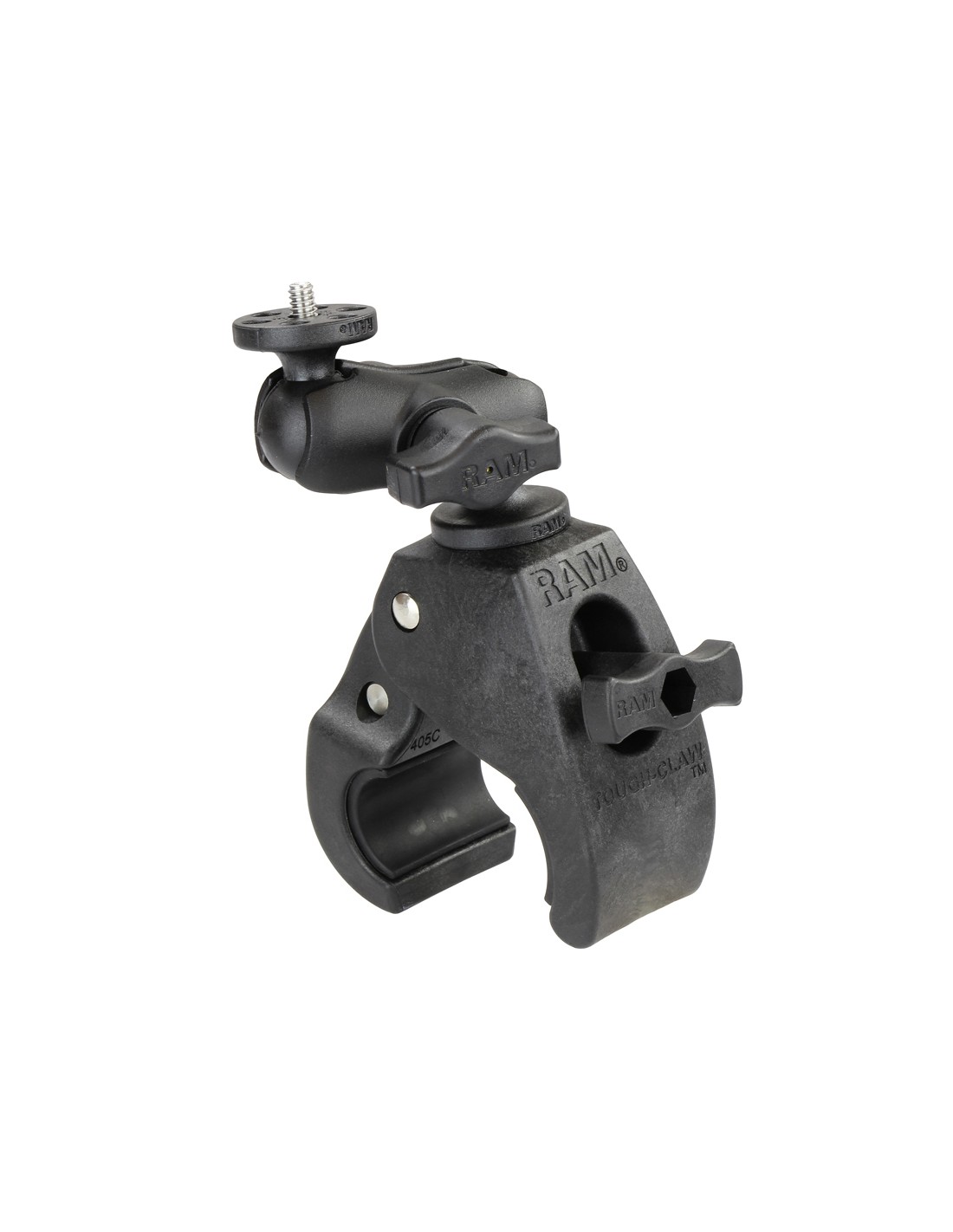 The RAM-B-404-A-366U consists of the medium RAM Tough-Claw base, short double socket arm and and 1" diameter ball with 1/4"-20 threaded stud for action cameras. The RAM Tough-Claw is the perfect mounting base for quick and easy tool-less installation and removal on round, square, odd shaped rails and bars. The RAM Tough-Claw can be clamped on rails from 1" - 1.6" outer diameter. The mount is designed with a RAM 1" diameter patented rubber ball and socket system that has adjustment points at both ends of the double socket arm; this allowing for almost infinite adjustment and perfect viewing angles.