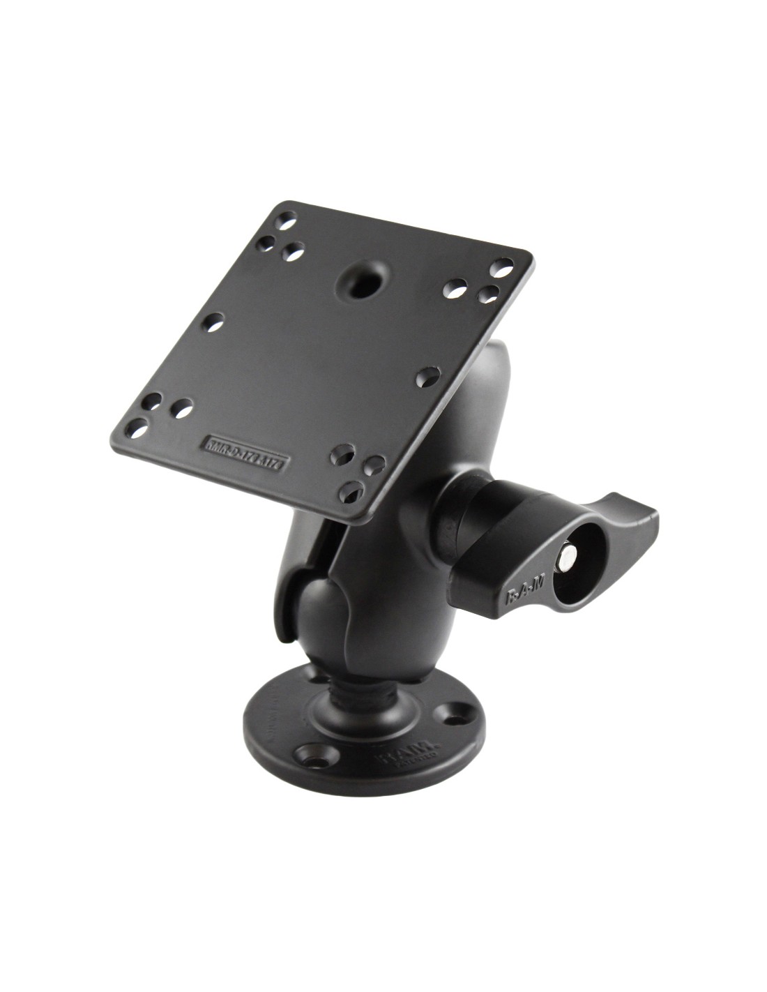 The RAM-D-101-C-ID1U consists of a 3.68" diameter round base, SHORT length double socket arm and 4.75" square plate. The 3.68" diameter round base has pre-drilled holes, including two holes at 180 degrees and three holes at 120 degrees. The 4.75" square plate contains 4x100mm holes and 4x75mm holes in each corner. Designed into the mount is a 2.25" diameter patented rubber ball and socket system with adjustment points at both socket ends of the arm. Rubber ball and socket technology allows for almost infinite adjustment and perfect viewing angles.