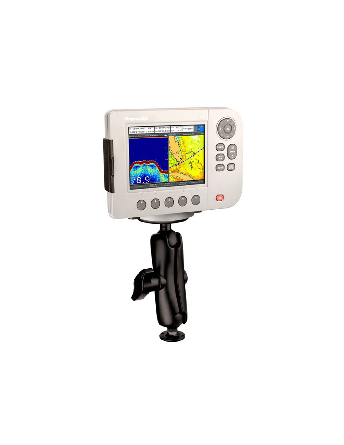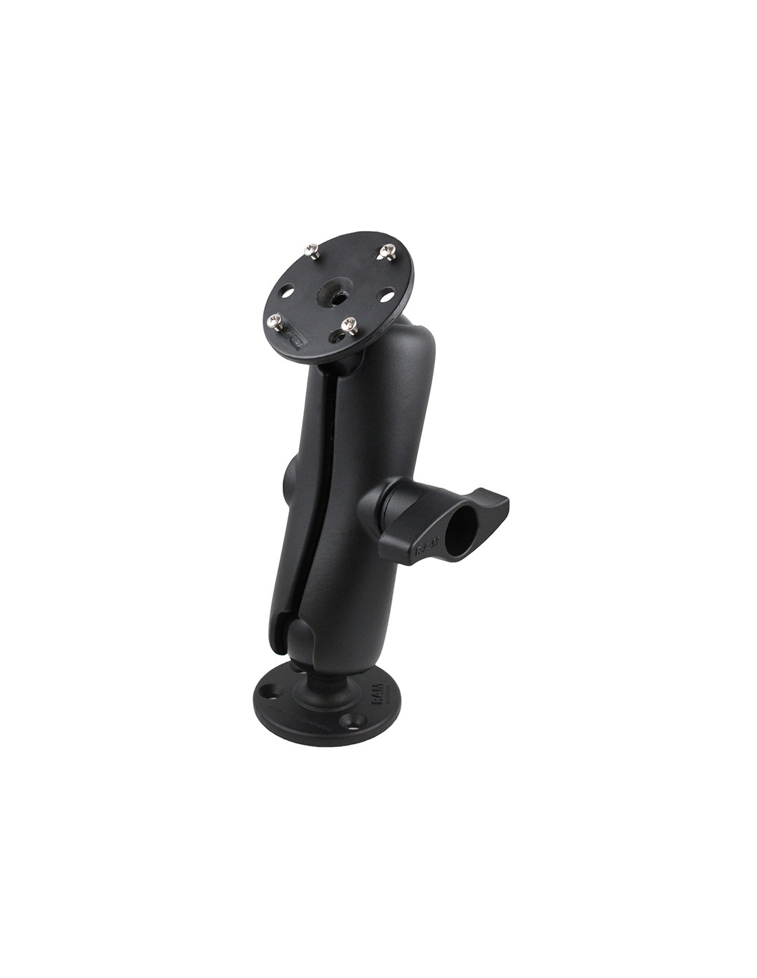 The RAM-D-101-RM1U consists of a 3.68" diameter round base with the universal AMPS hole pattern, STANDARD length double socket arm and 3.68" round base. The RAM-D-101-RM1U includes hardware that will attach Raymarine Chartplotters to the mount. Designed into the mount is a 2.25" diameter patented rubber ball and socket system with adjustment points at both socket ends of the arm.