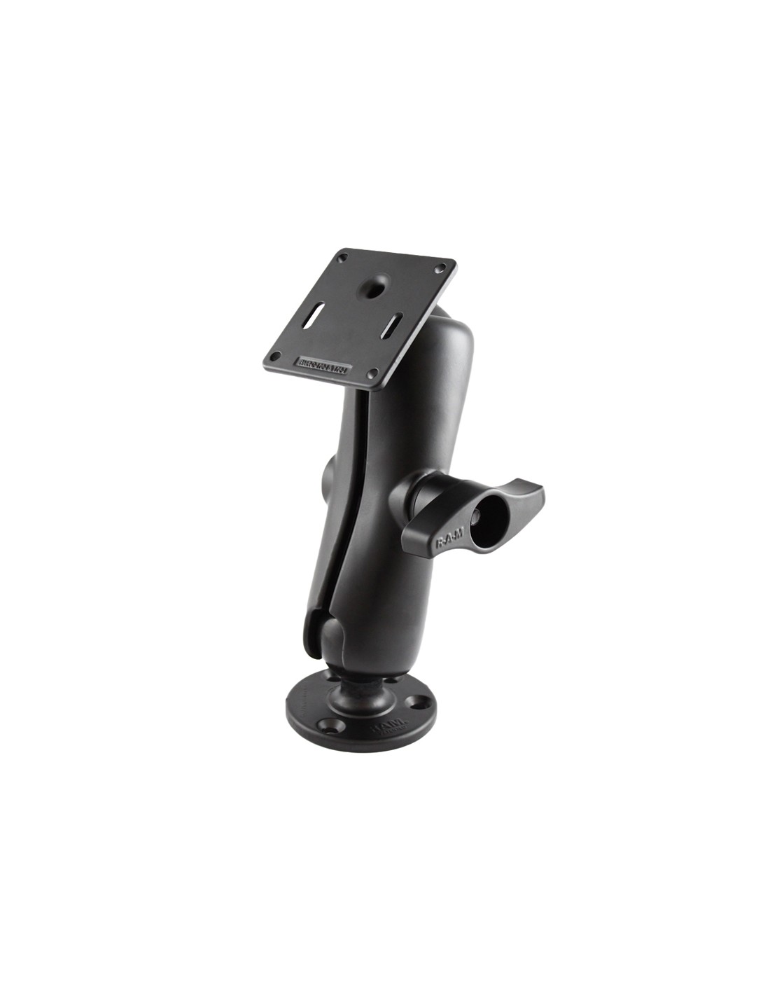 The RAM-D-101U-2461 consists of a 3.68" diameter round base, STANDARD length double socket arm and 3.625" square plate with the VESA hole pattern. The VESA plate contains a 75mm X 75mm hole pattern. The 3.68" diameter round base has pre-drilled holes, including two holes at 180 degrees and three holes at 120 degrees. Designed into the mount is a 2.25" diameter patented rubber ball and socket system with adjustment points at both socket ends of the arm. Rubber ball and socket technology allows for almost infinite adjustment and perfect viewing angles.