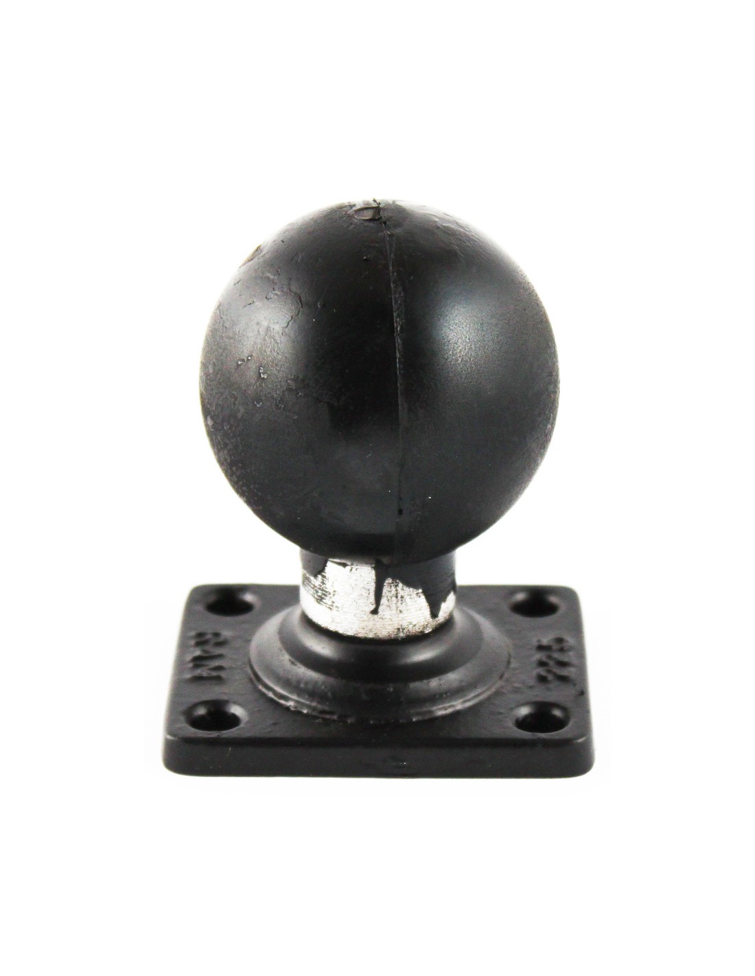 The RAM-D-202U-225 contains a 2.25" diameter rubber ball connected to a rectangular plate with a 4-hole pattern of 1.5" x 2" center to center.