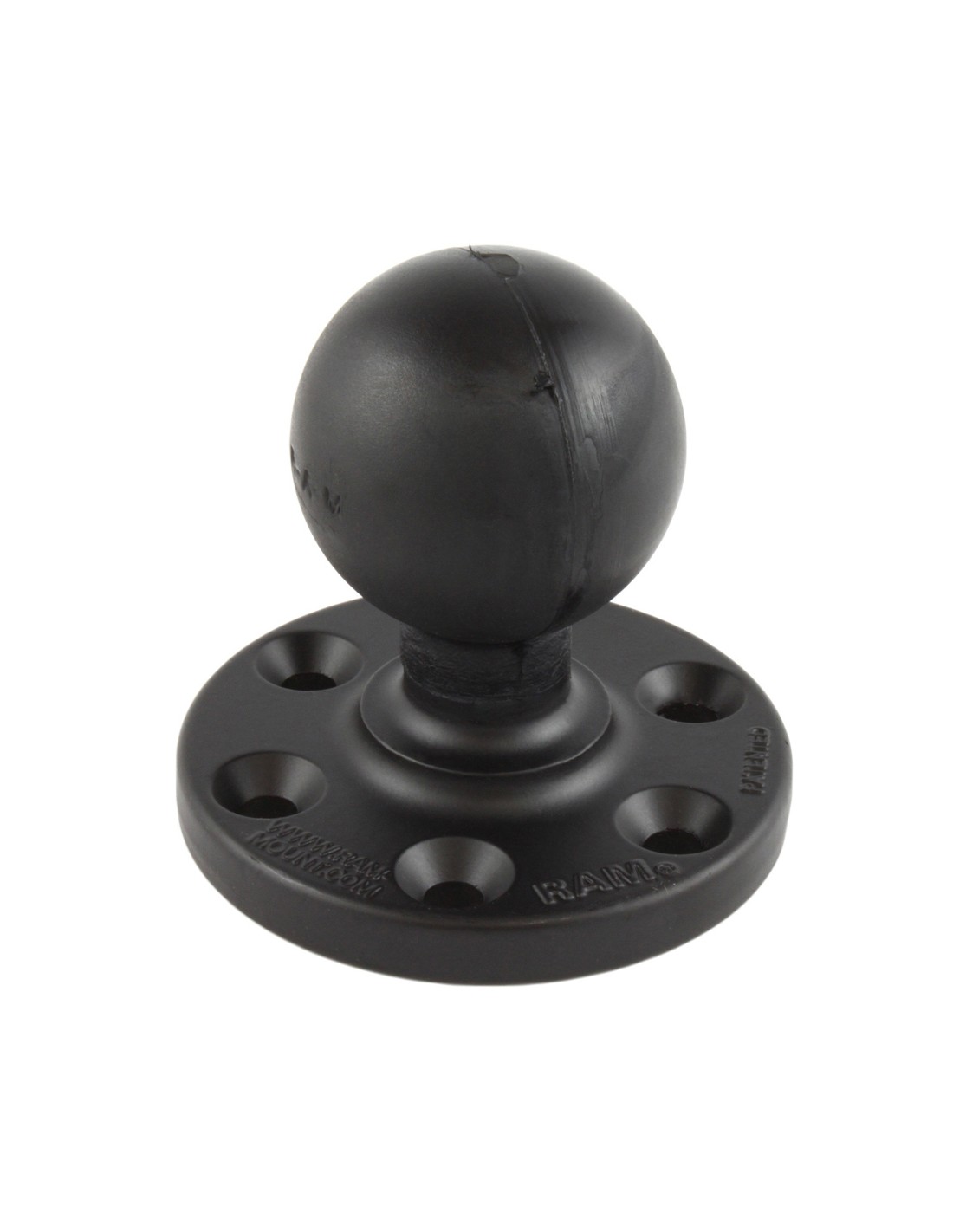 The RAM-D-202U-SYM1 consists of a 2.25" diameter rubber ball, connected at right angles to a 3.68" diameter round base. There are 6 pre-drilled holes in the base.