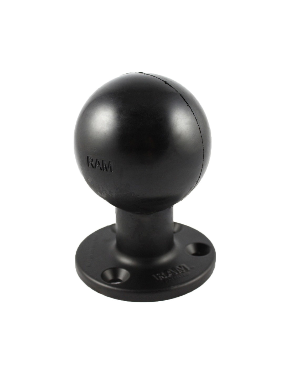 The RAM-E-202U consists of a 3.38" diameter rubber ball, connected at right angles to a 3.68" diameter round plate. The plate has pre-drilled holes in the base plate, including two holes at 180 degrees and three holes at 120 degrees.