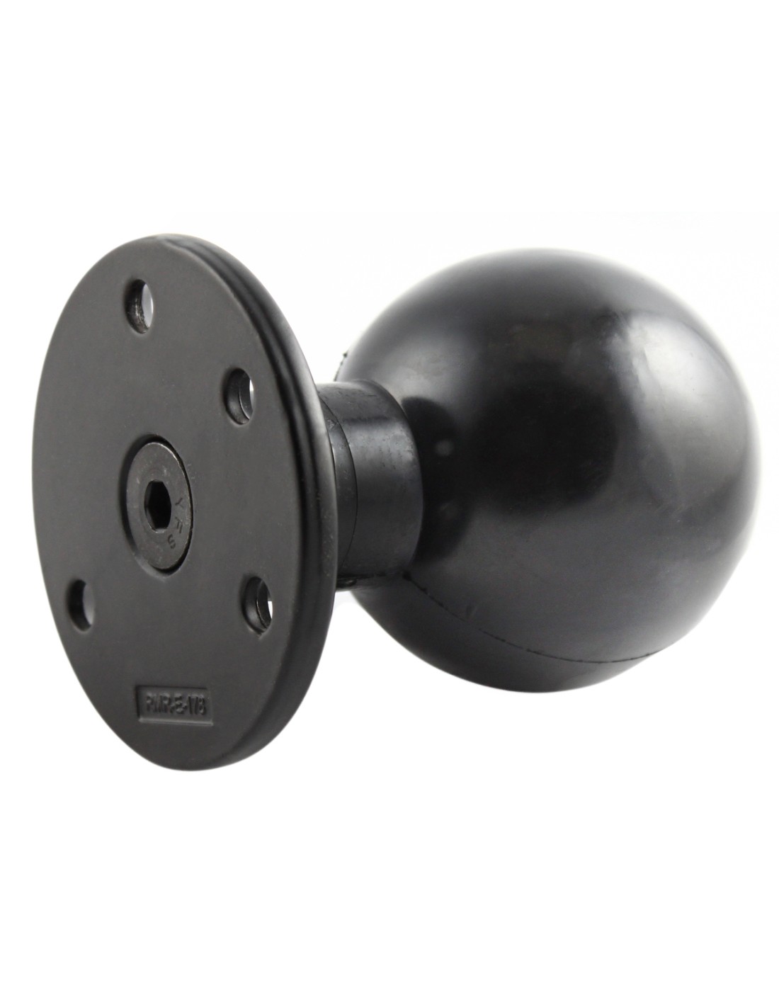 The RAM-E-202U-IN1 consists of a 3.38" diameter rubber ball, connected at right angles to a 3.68" diameter round plate. The plate has pre-drilled holes in the base plate, including two holes at 180 degrees and three holes at 120 degrees.