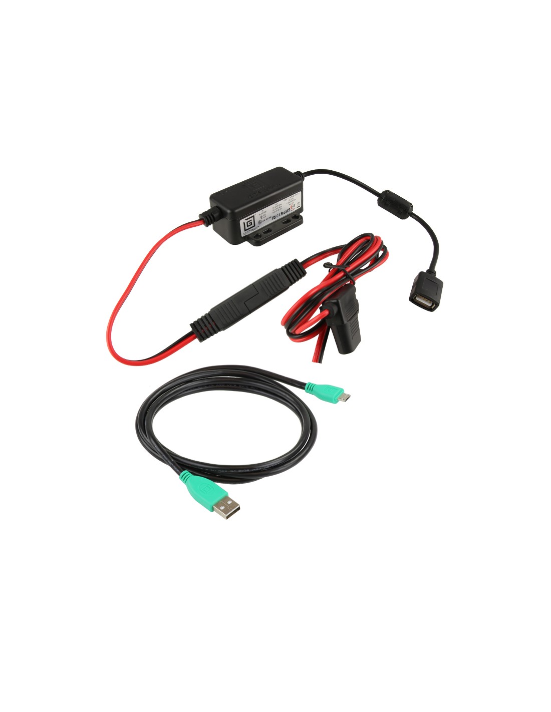 - Hardwire charger includes USB 2.0 cable with USB Type-A male connection and mUSB male connection