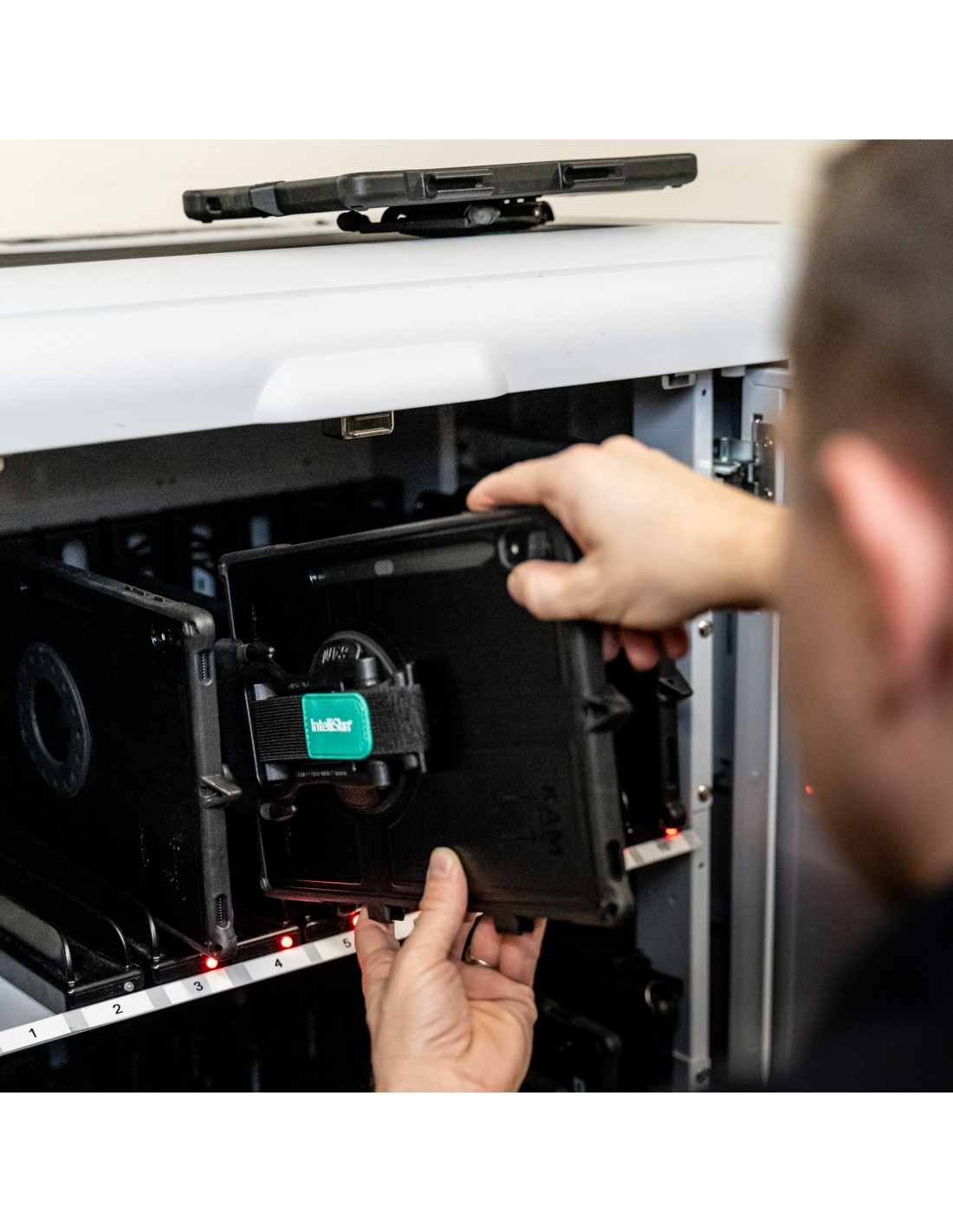 The GDS Slide Dock is a scalable solution for charging multiple devices at the same time. This version is compatible with Next Generation IntelliSkin sleeves. Designed to be integrated into a cabinet or portable charging station, each GDS Slide Dock can be permanently mounted to any surface by being bolted or screwed in. The GDS connectors height can be easily adjusted to accommodate different devices. The adjustable height settings are numbered to quickly set up for any cart or charging station. This GDS Slide Dock has a USB Type-C male output that supports Power Delivery and can plug into an existing USB port on a cart or into a multi-port USB charger. There is an LED indicator light that turns red when your dock is connected to power. Always Protected. Always Connected.
