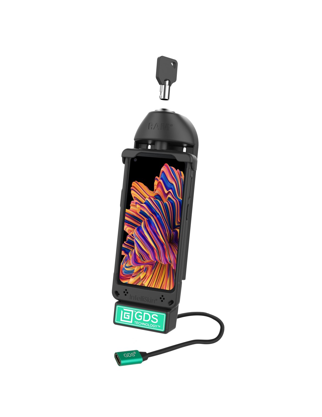 - Spring-loaded, key-locking vehicle dock featuring GDS® TechnologyT for data and fast charging capabilities for phones wrapped in an IntelliSkin®; uses USB Type-C to connect to power