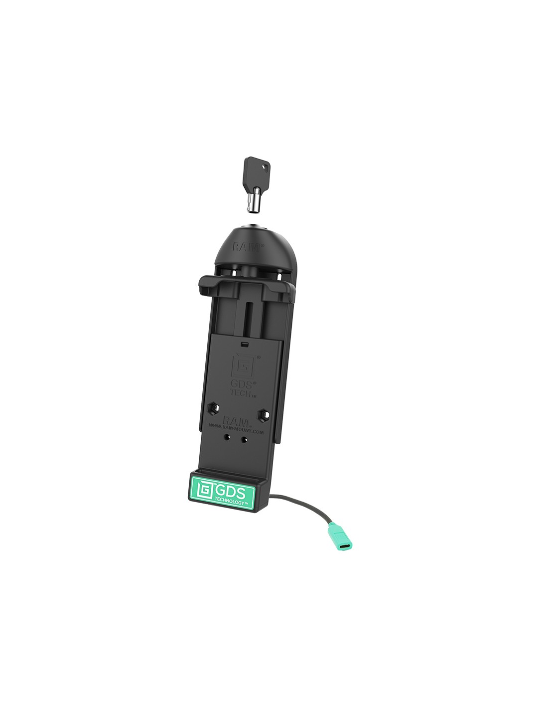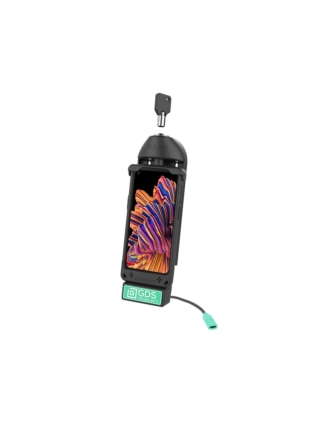 - Spring-loaded key locking vehicle dock featuring GDS® TechnologyT for data and fast charging capabilities for phones wrapped in IntelliSkin®; uses USB Type-C to connect to power