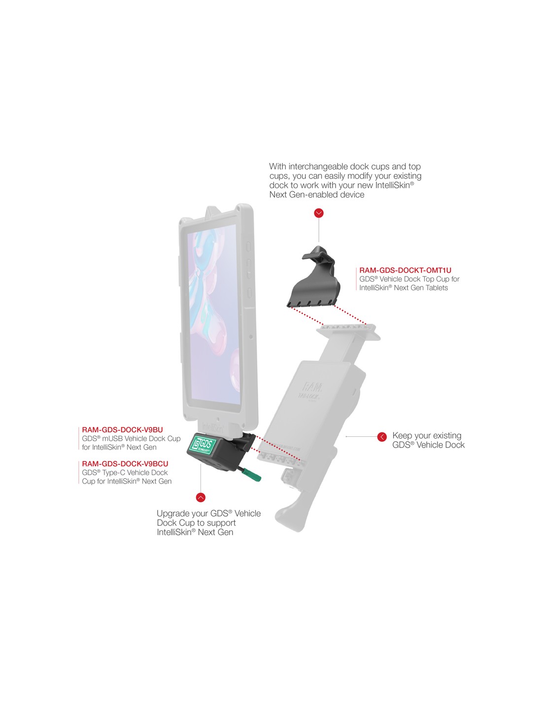 This GDS vehicle dock top cup is designed specifically to support IntelliSkin Next Generation-enabled devices, and uses the universal positioning marker to align and secure your tablet. When paired with the proper bottom cup, it can be used to upgrade your existing GDS vehicle dock. Always Protected. Always Connected.