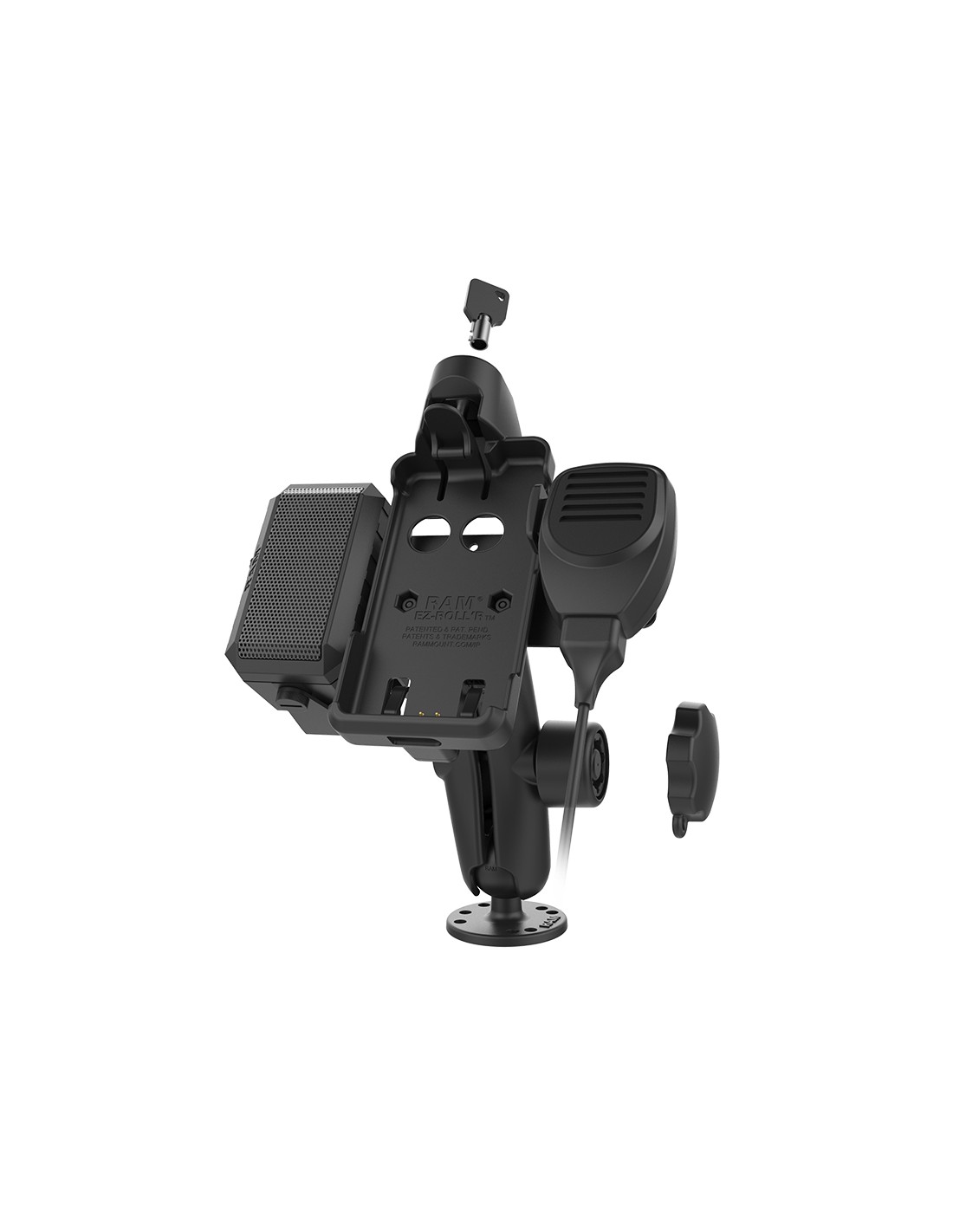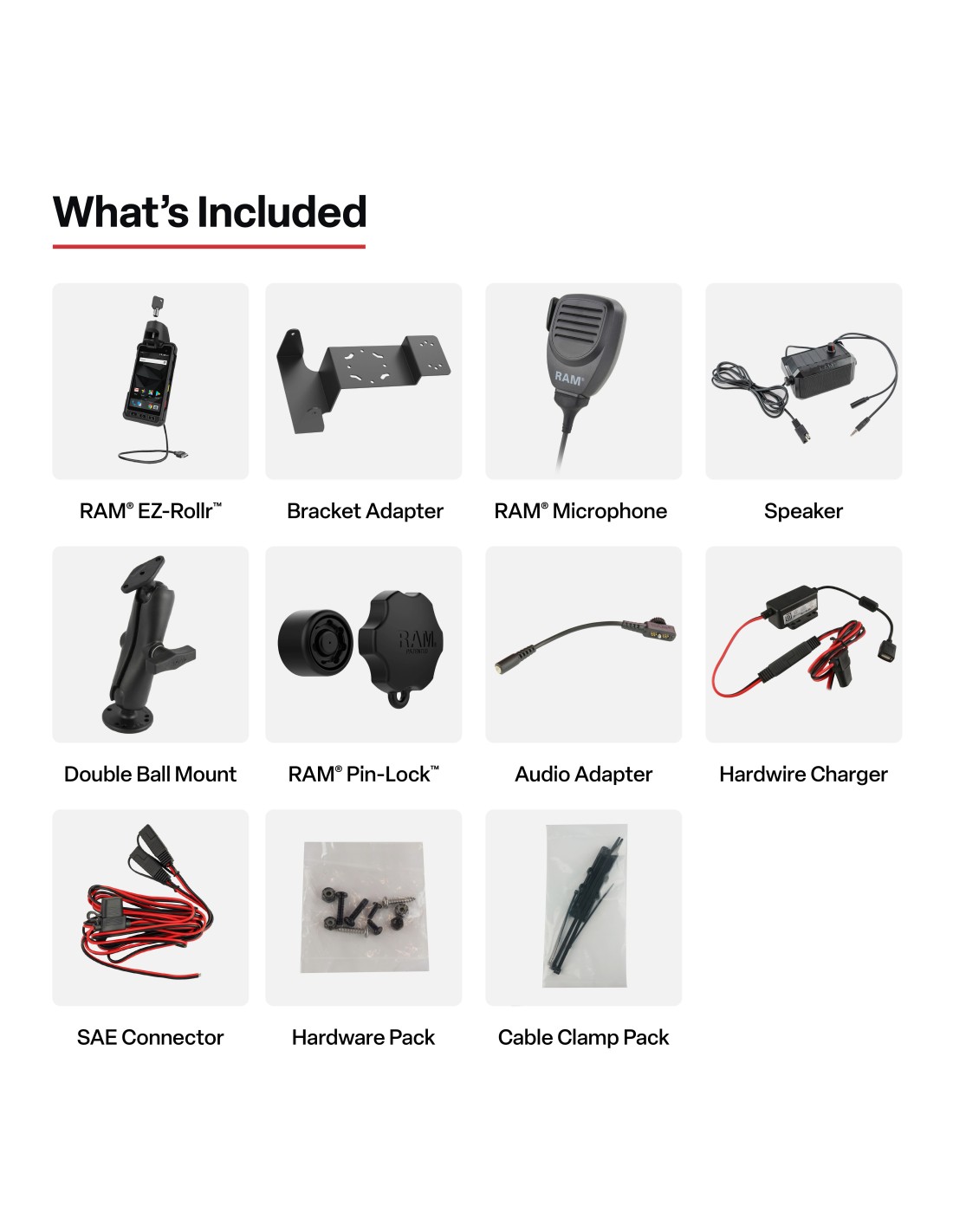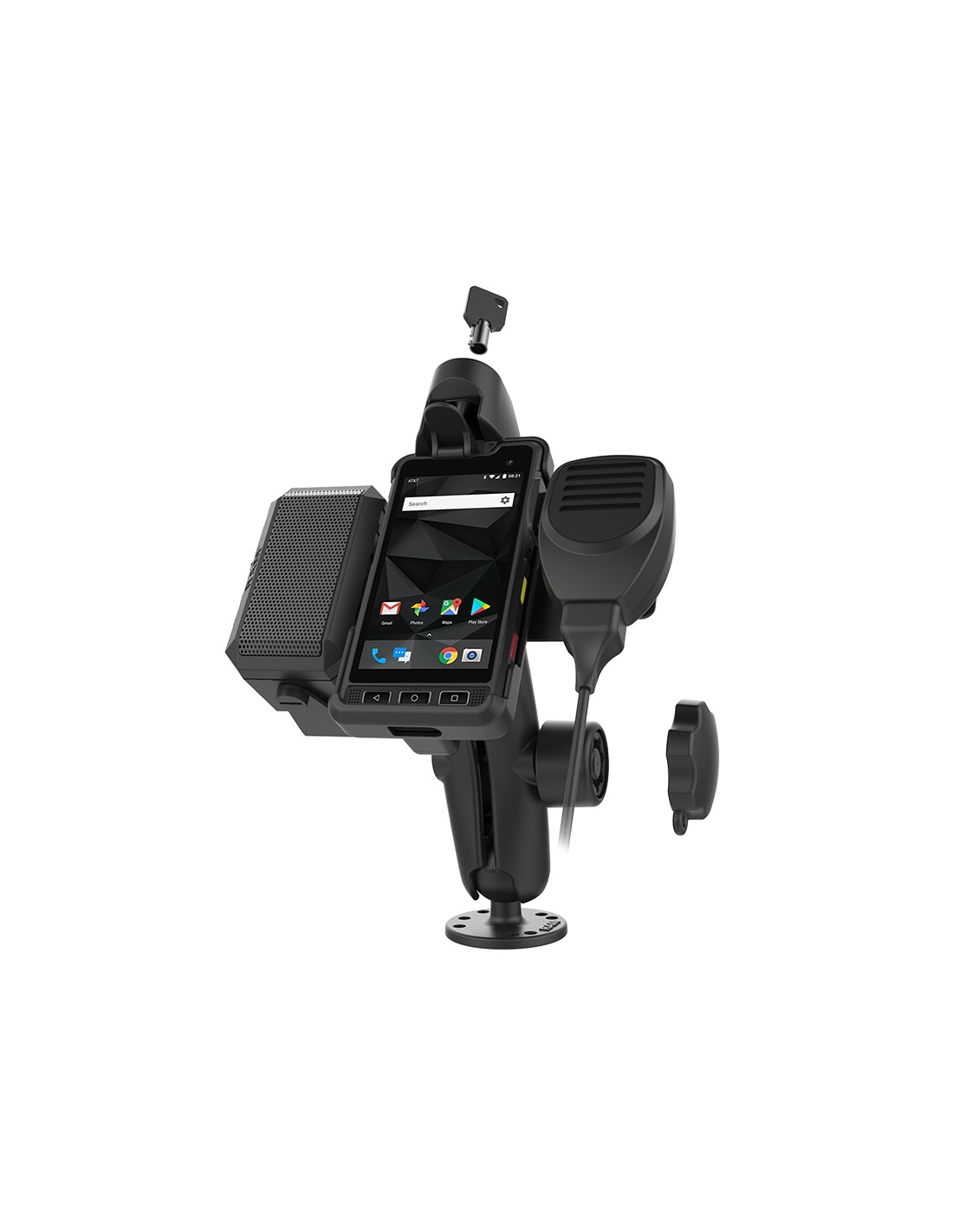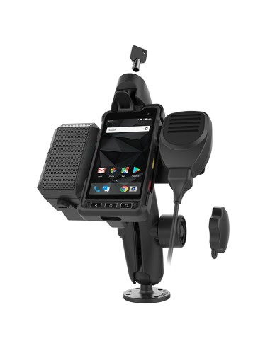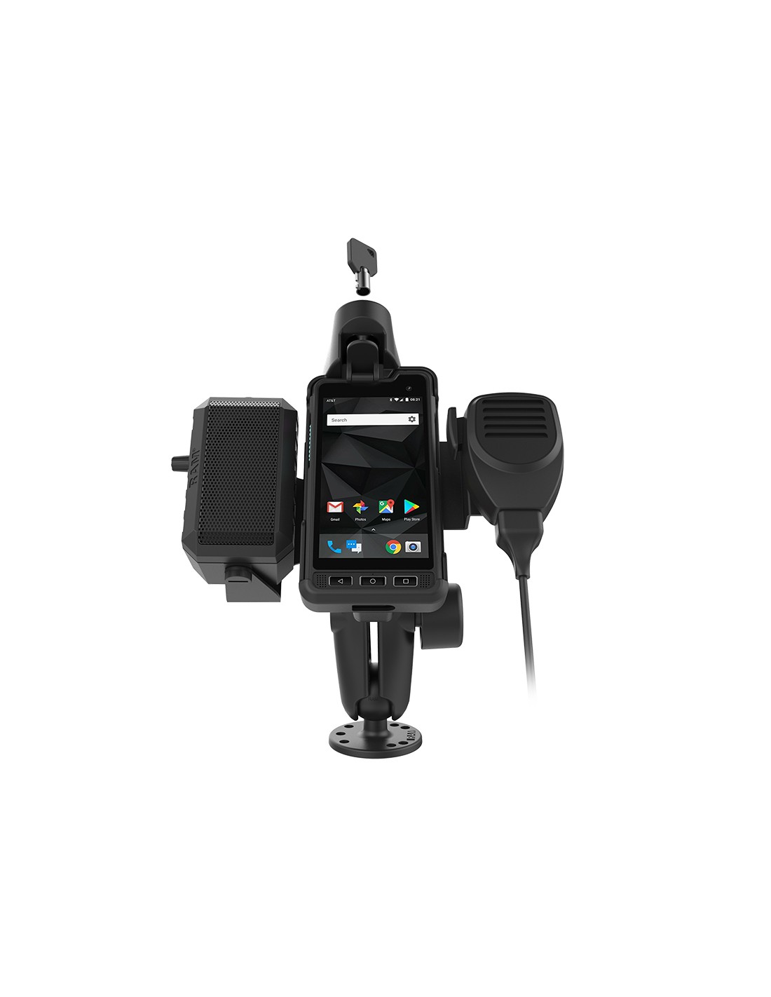 This Sonim XP8 bundle includes the RAM EZ-Roll'r Powered Key Locking Cradle for Sonim XP8, double ball mount with RAM Pin-Lock Security Knob, and a mounting bracket containing a speaker and microphone. This bundle secures your Sonim XP8 and keeps your peripherals together and connected as one unit. The powered cradle features two integrated pogo pins that provide charging capabilities to the device through a male USB Type-A connector, and includes key lock for extra security and peace of mind. The provided speaker connects to the Sonim usit using an included 10-pin to 3.5 audio adapter cable. Included with the complete bundle is a 10-30V modular vehicle hardwire charger. Optional backing plate not included