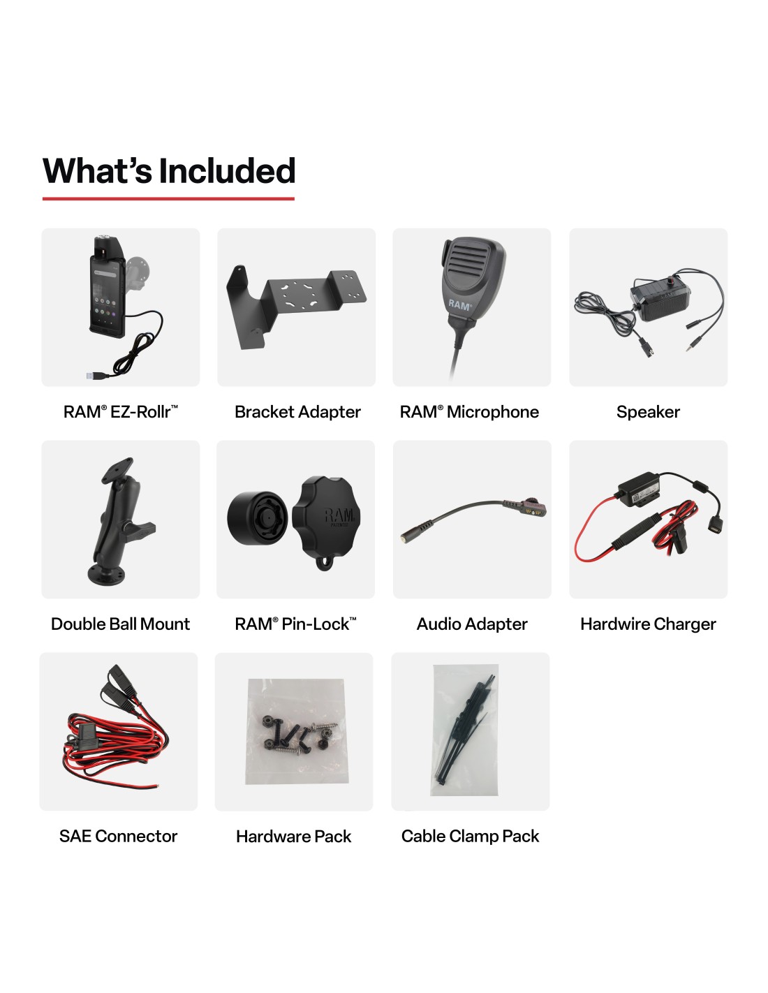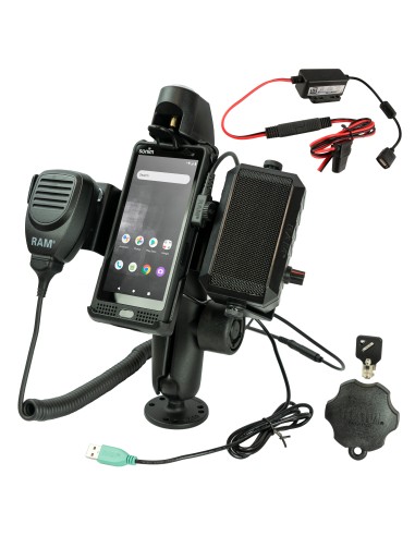 This Sonim XP10 bundle includes the RAM EZ-Roll'r Powered Key Locking Dock for Sonim XP10, double ball mount with RAM Pin-Lock Security Knob, and a mounting bracket containing a speaker and microphone. This bundle secures your Sonim XP10 and keeps your peripherals together and connected as one unit. The powered dock features two integrated pogo pins that provide charging capabilities to the device through a male USB Type-A connector and includes a key lock for extra security and peace of mind. The provided speaker connects to the Sonim unit using an included 10-pin to 3.5 audio adapter cable. Included with the complete bundle is a 10-30V modular vehicle hardwire charger. Optional backing plate not included