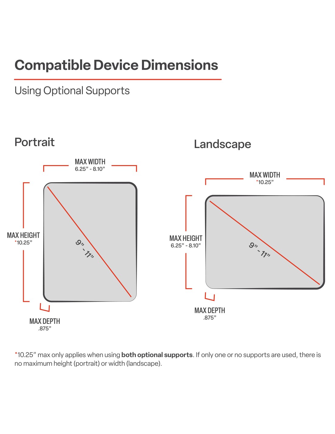 Max Height: 10.25" (using optional supports)