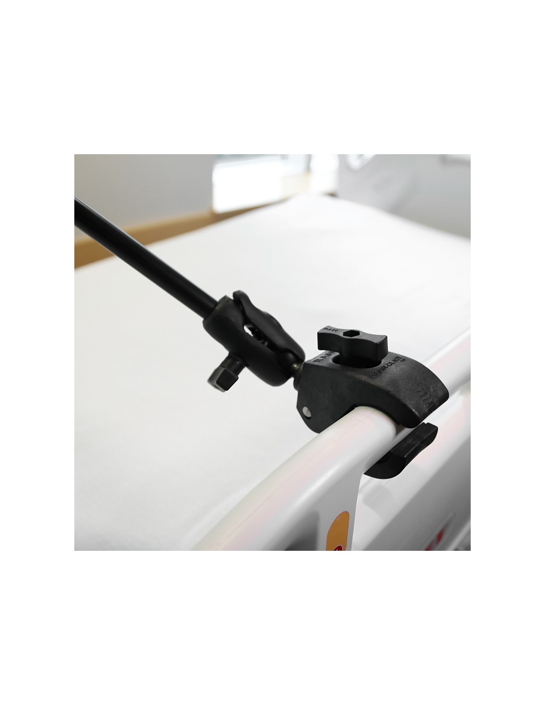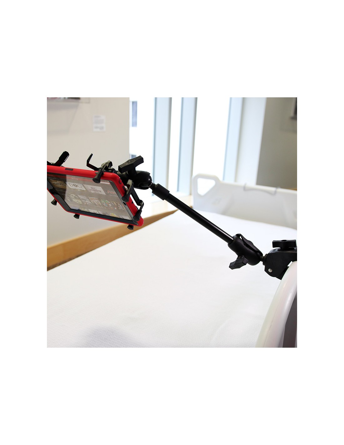 This bedside mounting kit for 9-10 tablets includes the large RAM Tough-Claw clamping base, 9 extension pole, swiveling double socket arm, and the RAM X-Grip universal tablet holder. The RAM Tough-Claw attaches with the twist of a knob to bedside rails and bars that range from 1 to 2.25 in outer diameter. Both a 9 long extension pole and swiveling double socket arm can be easily adjusted to keep the RAM X-Grip universal tablet holder in an ideal viewing and operating position. When not in use, the tablet holder and extension pole can simply be rotated away from the bed.