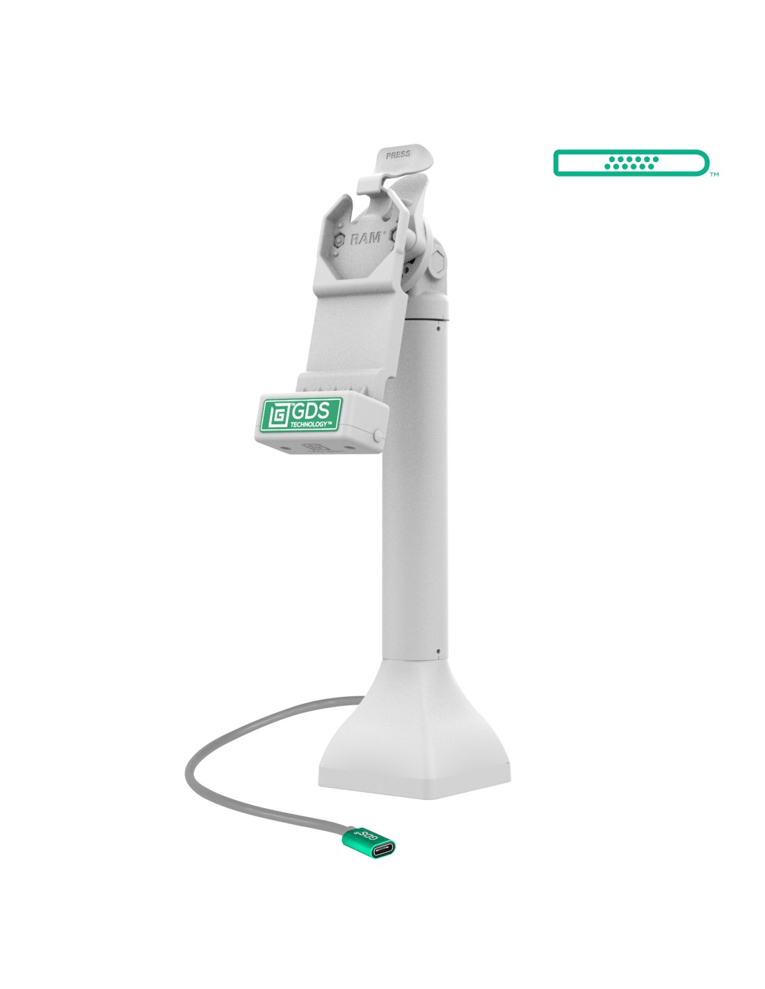 - Light gray 14" pedestal dock for devices enclosed in an IntelliSkin® with D-shaped bottom connection and GDS® Uni-ConnT Adapter