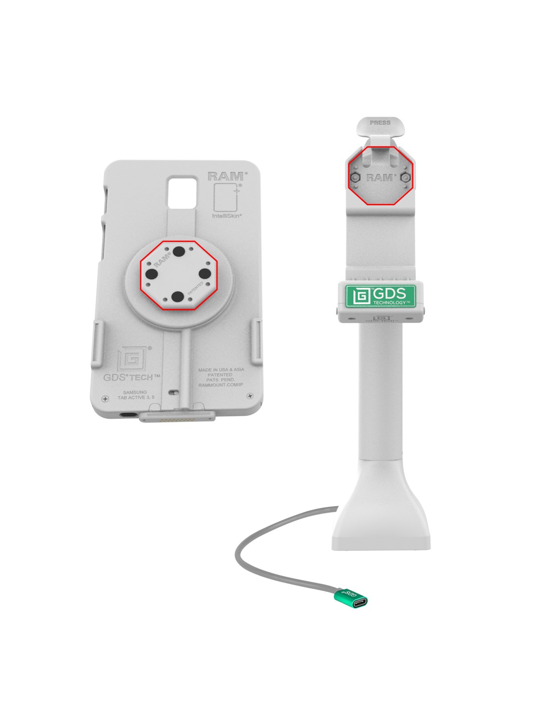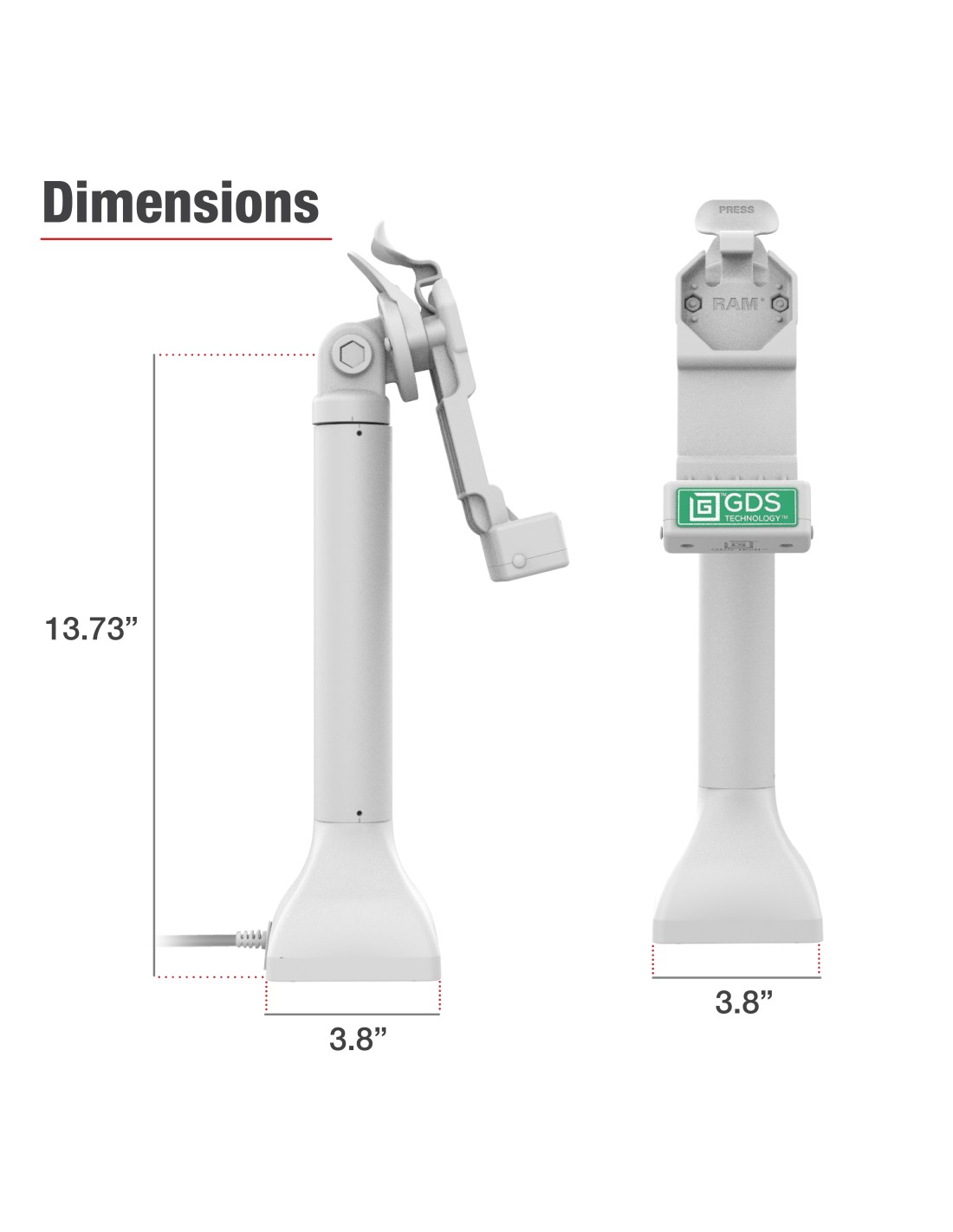 The GDS Uni-Conn 14" Pedestal Dock with USB-C - Gray (RAM-GDS-DOCK-D11-14-U1C-GRY) is a free-standing, 14" pedestal dock for devices enclosed in an IntelliSkin Next Gen, IntelliSkin Hard Case, or standard IntelliSkin Thin-Case with a GDS Uni-Conn adapter. This solution can swivel 180 degrees and allows devices to tilt 180 degrees, which is ideal for customer-centric industries like retail, hospitality, food service, and more. Power is provided to the pogo pins integrated into the GDS Uni-Conn dock via USB-C connection. This dock features a drill-down attachment style, providing a stable base for the tall dock. The light gray aesthetic is ideal for sophisticated, bright workplaces. One Dock to Connect Them All Always Protected. Always Connected.
