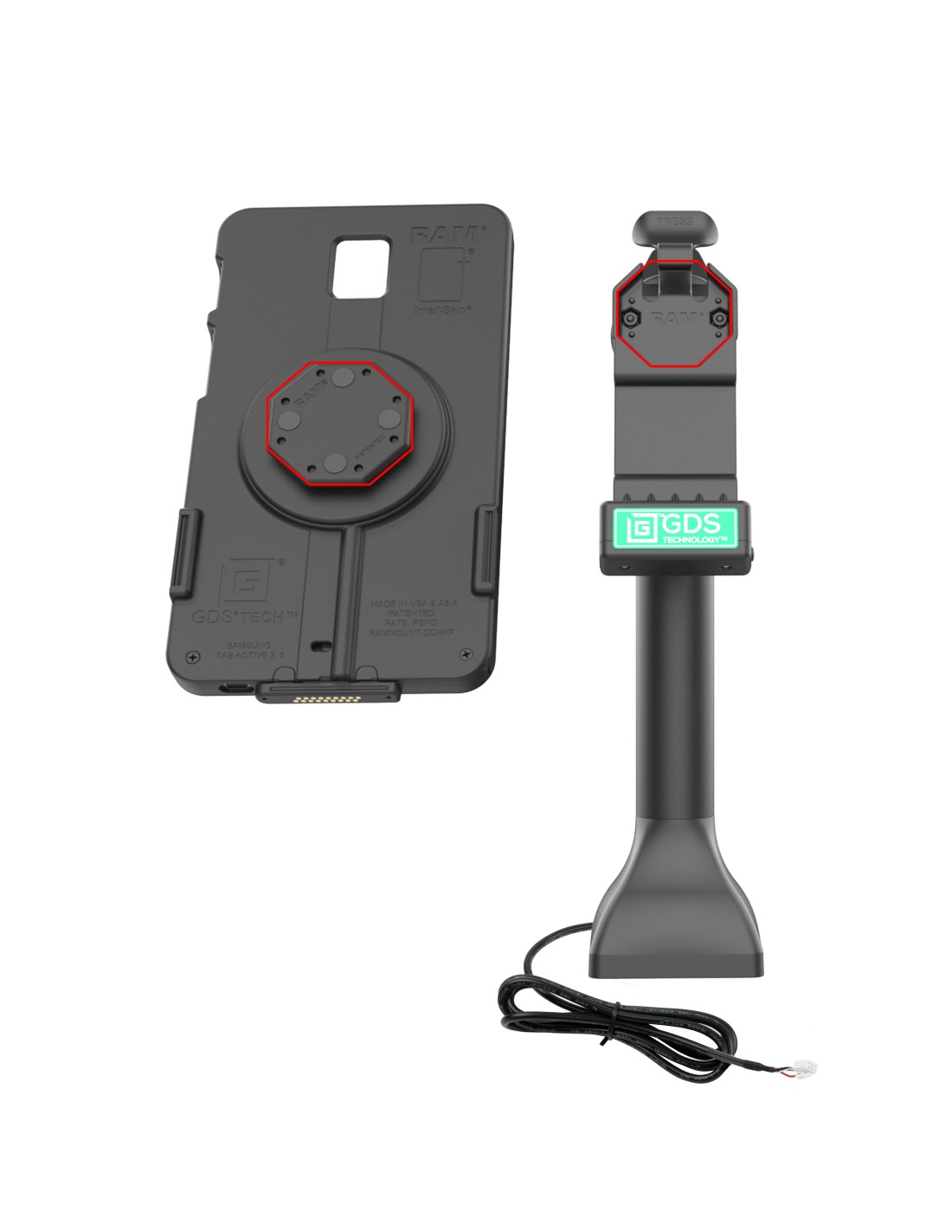 - 14" pedestal dock for devices enclosed in an IntelliSkin® with D-shaped bottom connection and GDS® Uni-ConnT Adapter