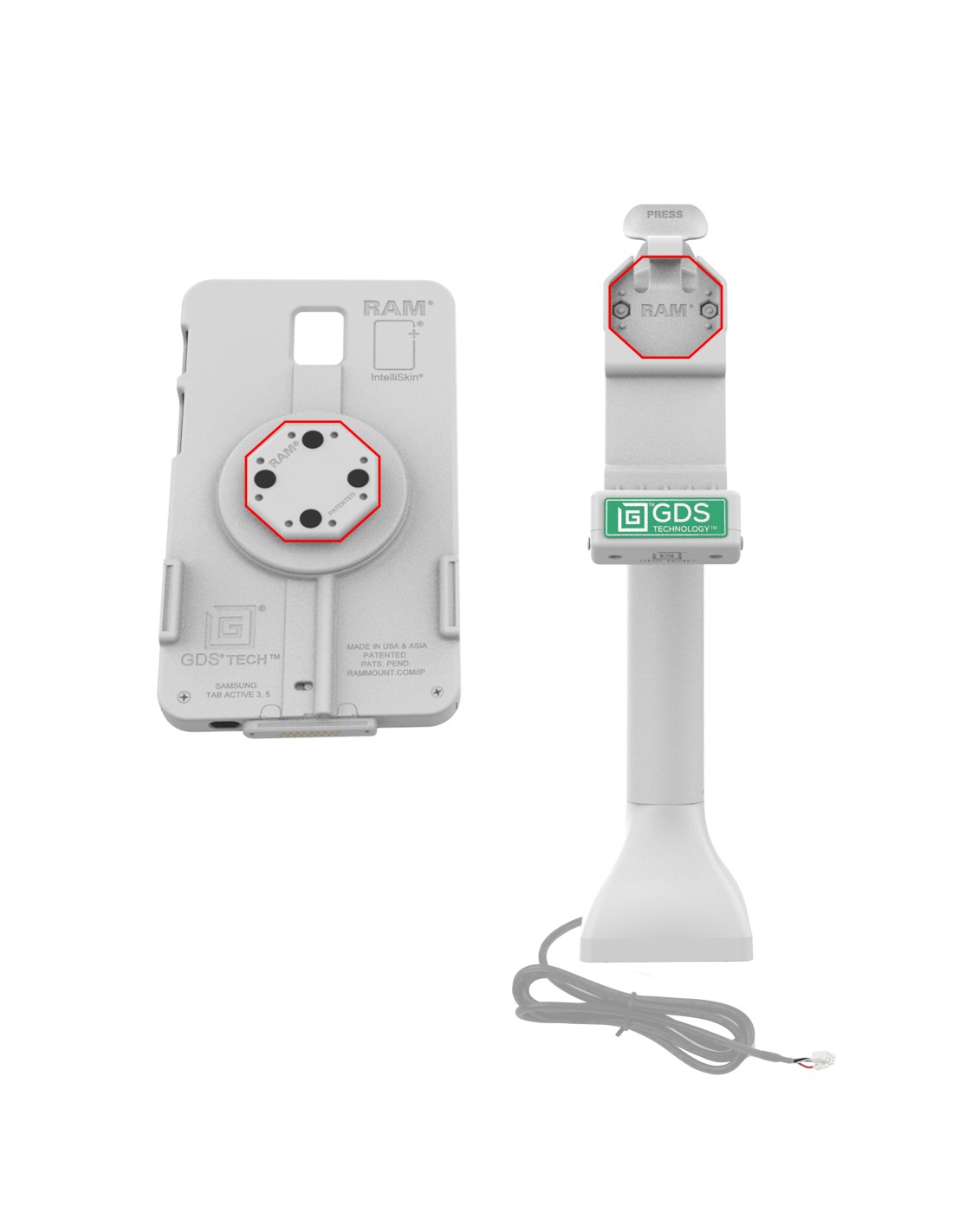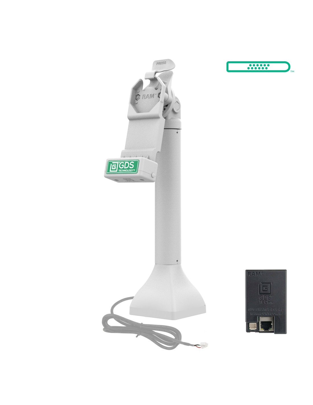 The GDS Uni-Conn 14" Pedestal Dock with PoE - Gray (RAM-GDS-DOCK-D11-14-U1E-GRY) is a free-standing, 14" pedestal dock for devices enclosed in an IntelliSkin Next Gen, IntelliSkin Hard Case, or standard IntelliSkin Thin-Case with a GDS Uni-Conn adapter. This solution can swivel 180 degrees and allows devices to tilt 180 degrees, which is ideal for customer-centric industries like retail, hospitality, food service, and more. Power is provided to the pogo pins integrated into the GDS Uni-Conn dock via Power over Ethernet (PoE) connection. This dock features a drill-down attachment style, providing a stable base for the tall dock. The light gray aesthetic is ideal for sophisticated, bright workplaces. One Dock to Connect Them All Always Protected. Always Connected.