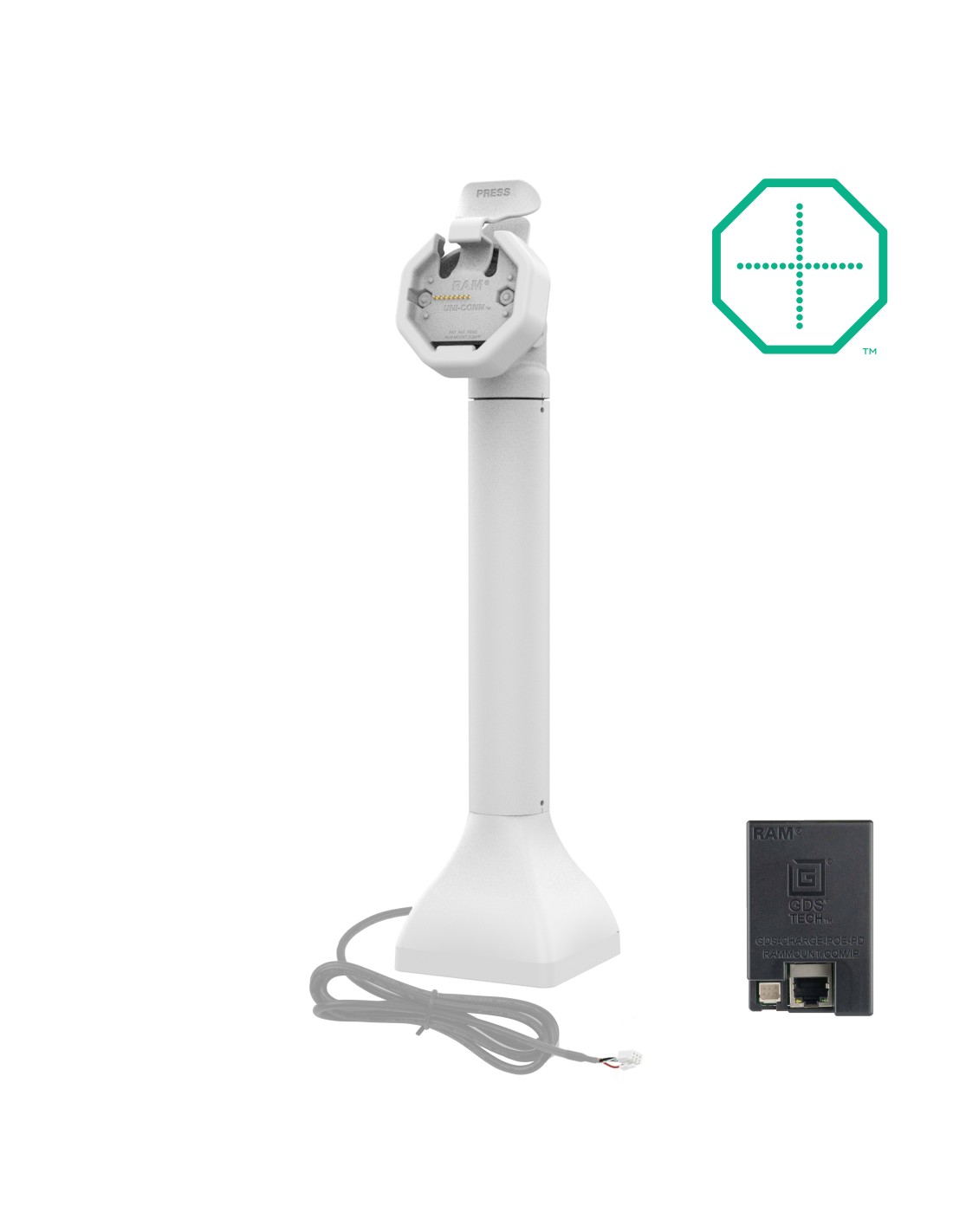 - GDS® connector and pogo pins provide charging via Power over Ethernet (PoE); Mechanical attachment mechanism allows for quick docking and undocking