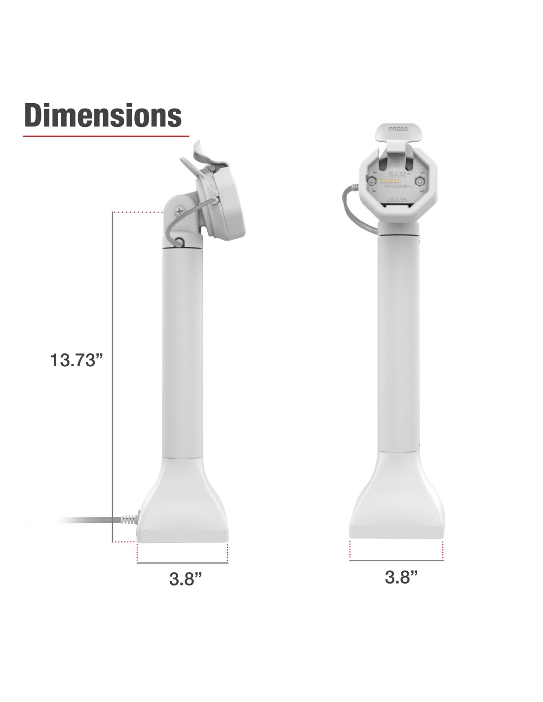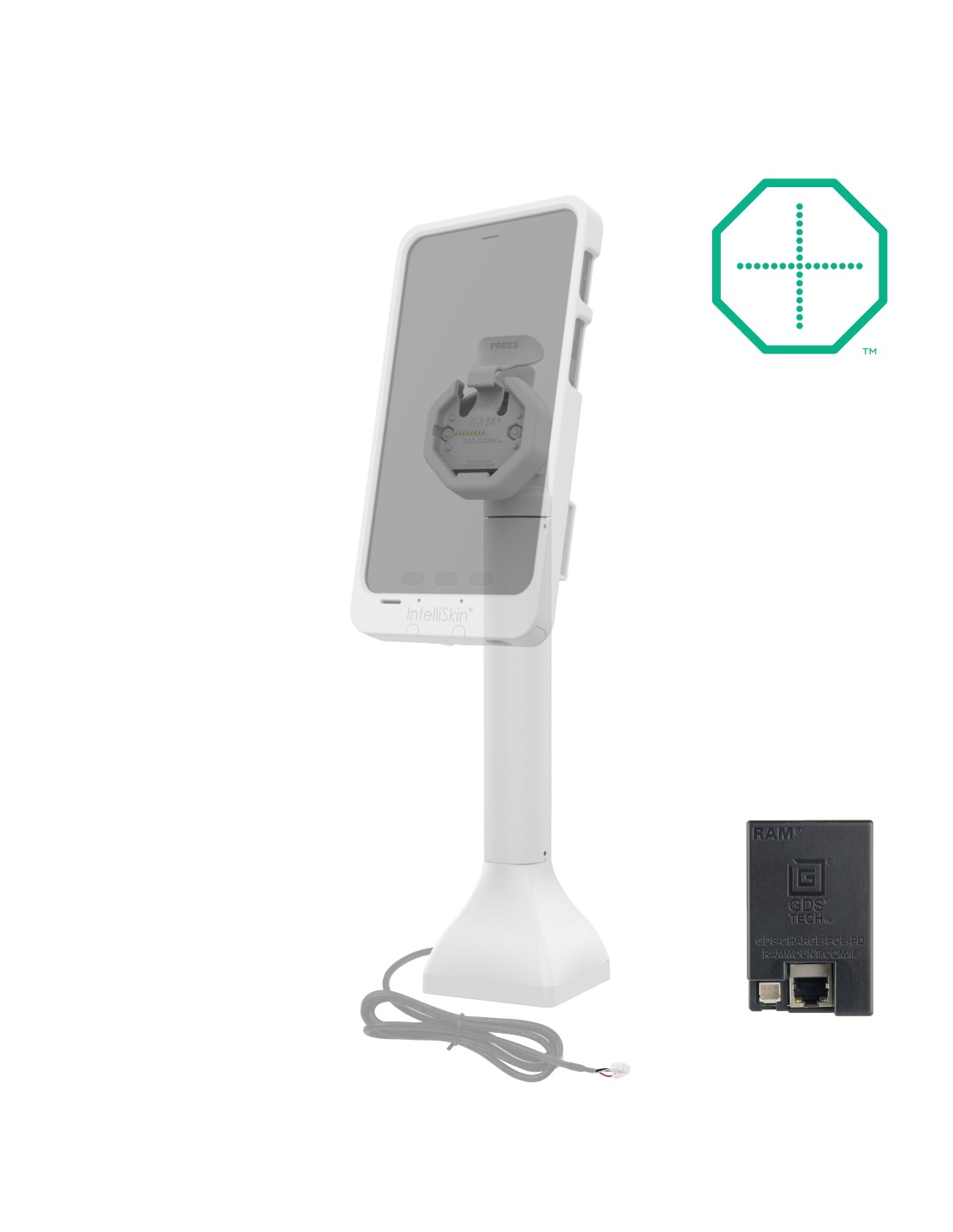 The GDS Uni-Conn Powered 14" Pedestal Dock with PoE - Gray (RAM-GDS-DOCK-D11-14-U3E-GRY) is a free-standing, 14" pedestal dock for devices enclosed in an IntelliSkin Thin-Case with Rear Pogo Pads. This solution can swivel 180 degrees and allows devices to tilt 180 degrees, which is ideal for customer-centric industries like retail, hospitality, food service, and more. Easily dock and undock your device with the assistance of the mechanical attachment mechanism. Power is provided to the pogo pins integrated into the GDS Uni-Conn adapter via Power over Ethernet (PoE) connection. This dock features a drill-down attachment style, providing a stable base for the tall dock. The light gray aesthetic is ideal for sophisticated, bright workplaces. One Dock to Connect Them All Always Protected. Always Connected.