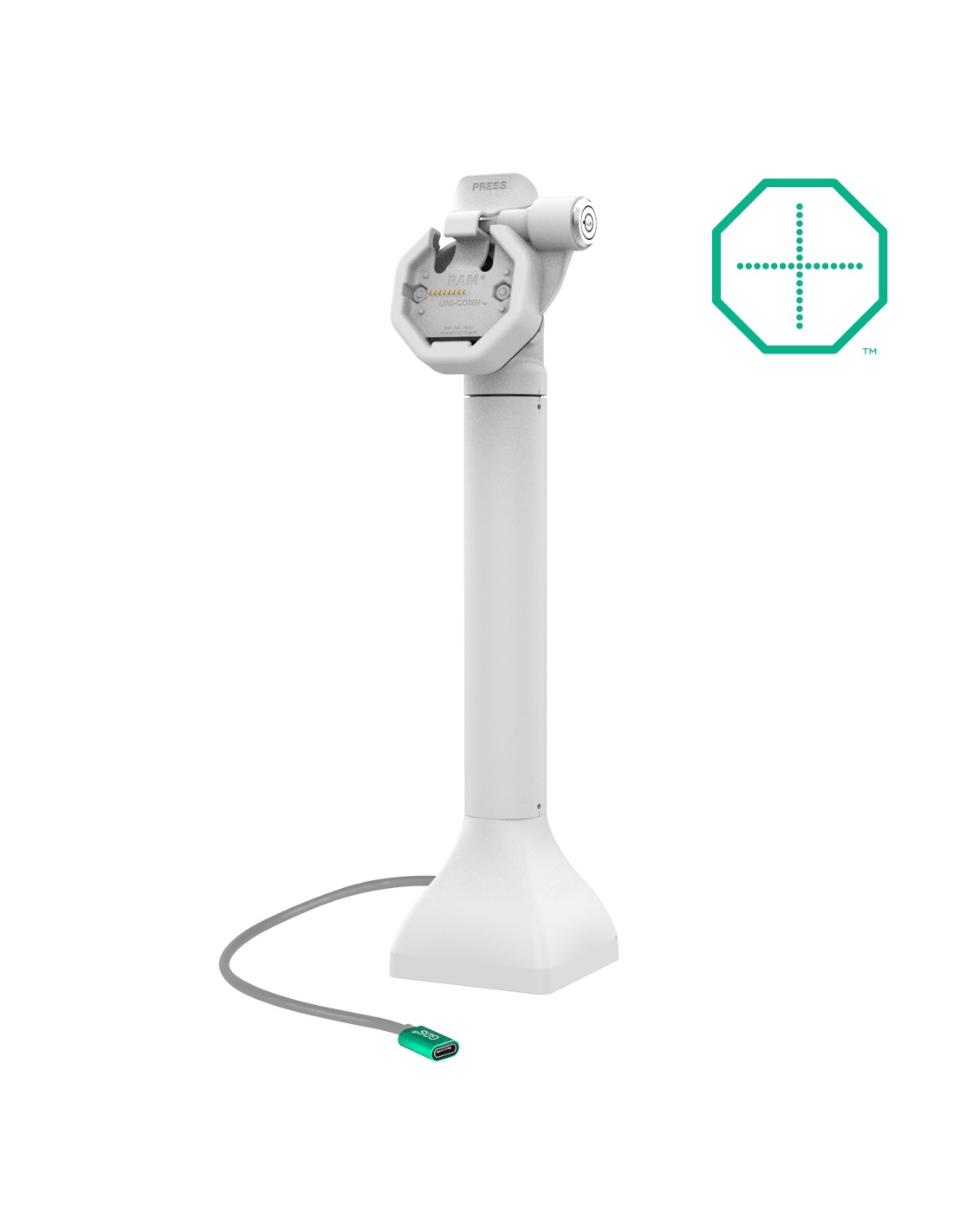 The GDS Uni-Conn Powered 14" Locking Pedestal Dock with USB-C - Gray (RAM-GDS-DOCKLR-D11-14-U3C-GRY) is a free-standing, 14" pedestal dock for devices enclosed in an IntelliSkin Thin-Case with Rear Pogo Pads. This solution can swivel 180 degrees and allows devices to tilt 180 degrees, which is ideal for customer-centric industries like retail, hospitality, food service, and more. Keep your device safe in high-traffic environments with the key lock, integrated to provide additional theft deterrence. Easily dock and undock your device with the assistance of the mechanical attachment mechanism. Power is provided to the pogo pins integrated into the GDS Uni-Conn adapter via USB-C connection. This dock features a drill-down attachment style, providing a stable base for the tall dock. The light gray aesthetic is ideal for sophisticated, bright workplaces. One Dock to Connect Them All Always Protected. Always Connected.