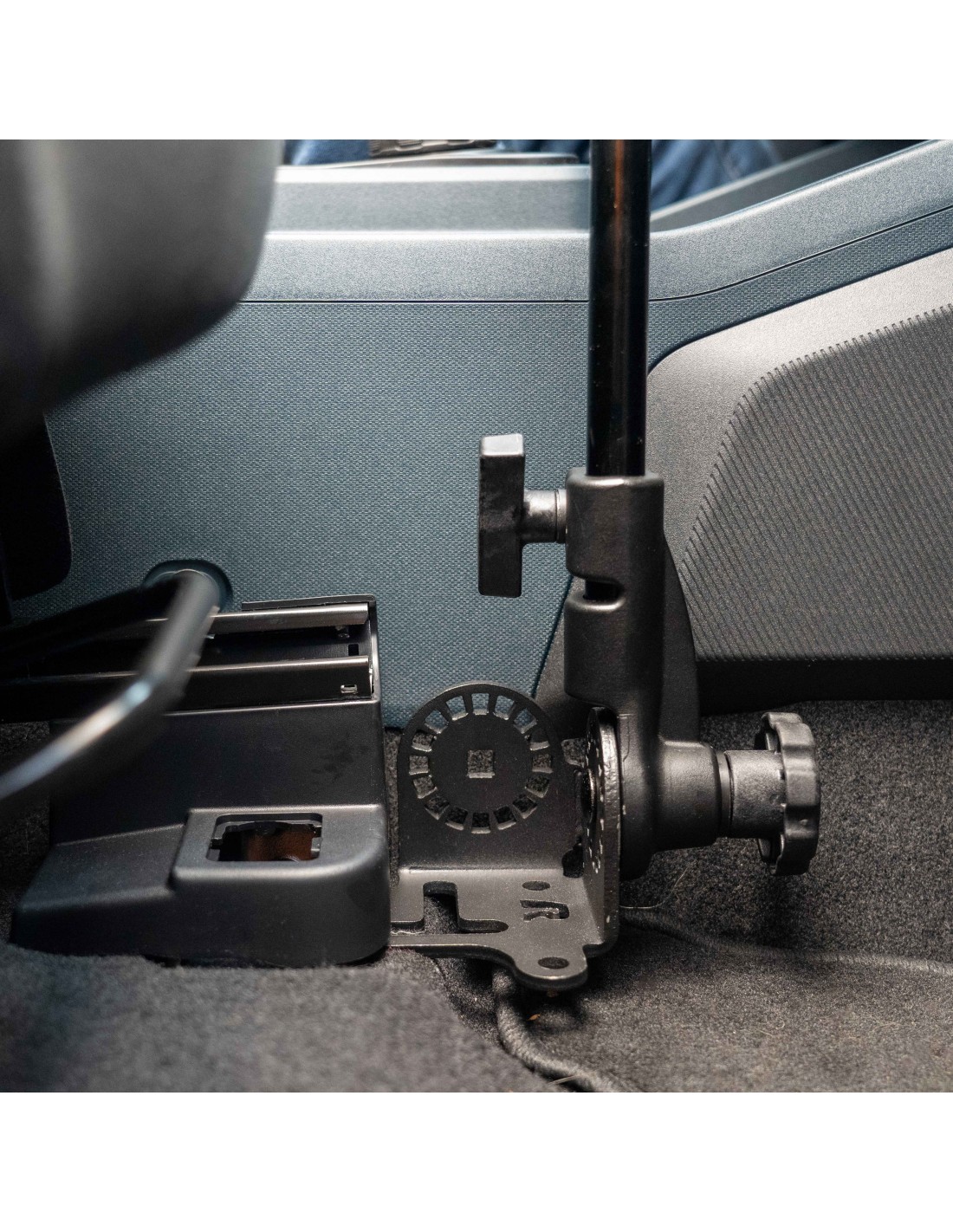- Universal vehicle mount attaches to seat rail without any drilling necessary; ideal for tablets and small laptops