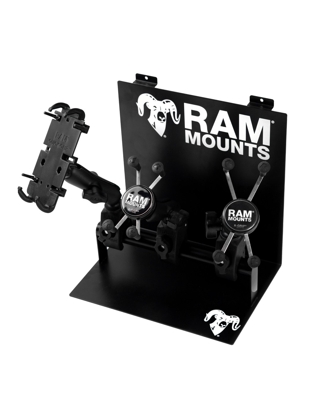 This powder coated steel countertop display (RAM-DISPLAY-COUNTER1-GENERIC) is the perfect desktop or slatted wall display for showcasing clamping style mounts. Mount up to three clamping style mounts to the 1" bar and pair with any small device holder for the ultimate in-person selling tool.
