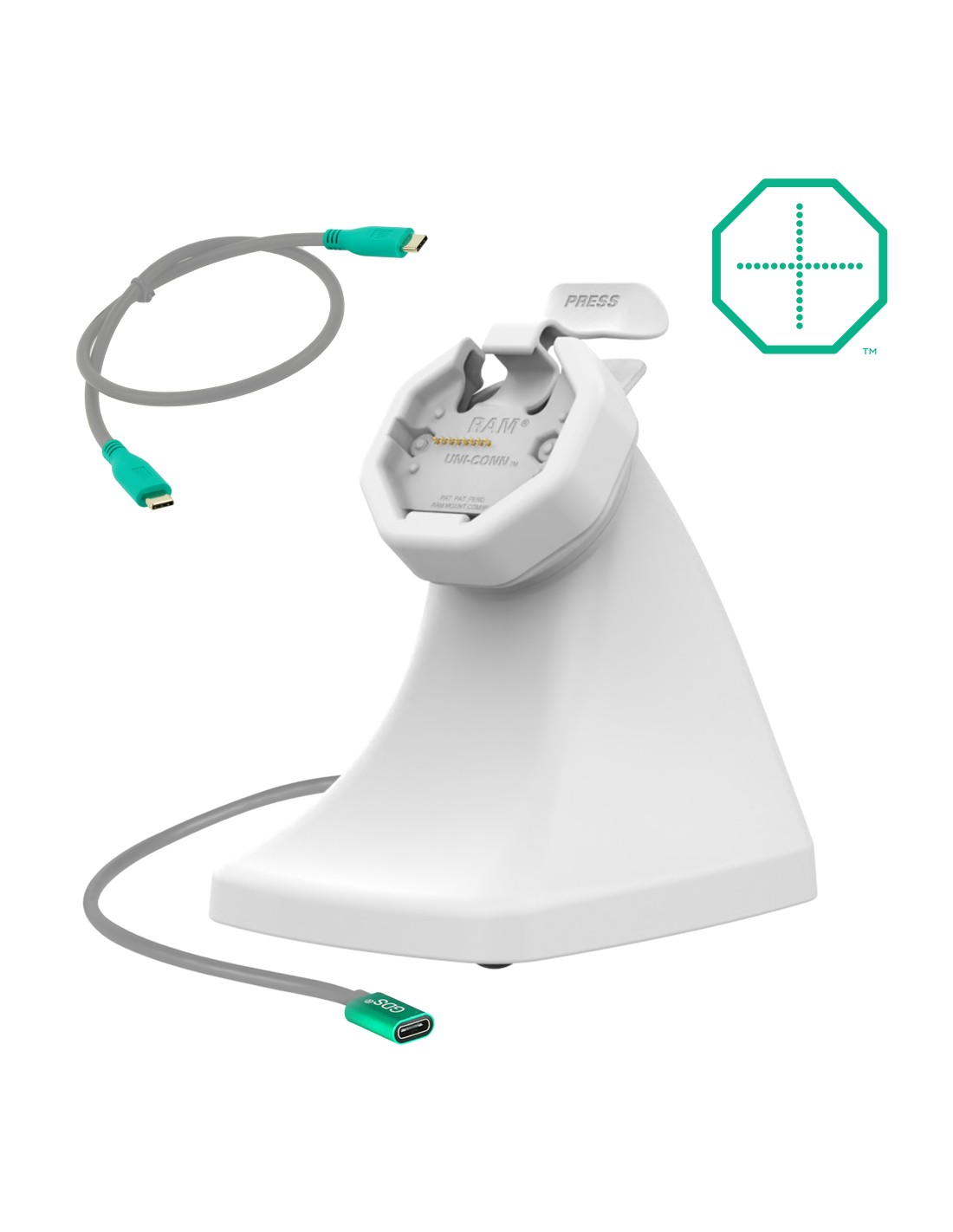 The GDS Uni-Conn Powered Snap-In Kiosk Dock with USB-C - Gray (RAM-GDS-DOCK-D10K-U3-C-GRY) is a free-standing, powered dock for devices enclosed in an IntelliSkin Thin-Case with Rear Pogo Pads. Securely dock and undock your device with the assistance of the mechanical attachment mechanism. Power is provided to the pogo pins integrated into the GDS Uni-Conn adapter via USB-C connection. This dock features a weighted base and rubber pads that offer theft deterrence and prevent it from sliding around on surfaces. The light gray aesthetic is ideal for sophisticated, bright workplaces. One Dock to Connect Them All Always Protected. Always Connected.