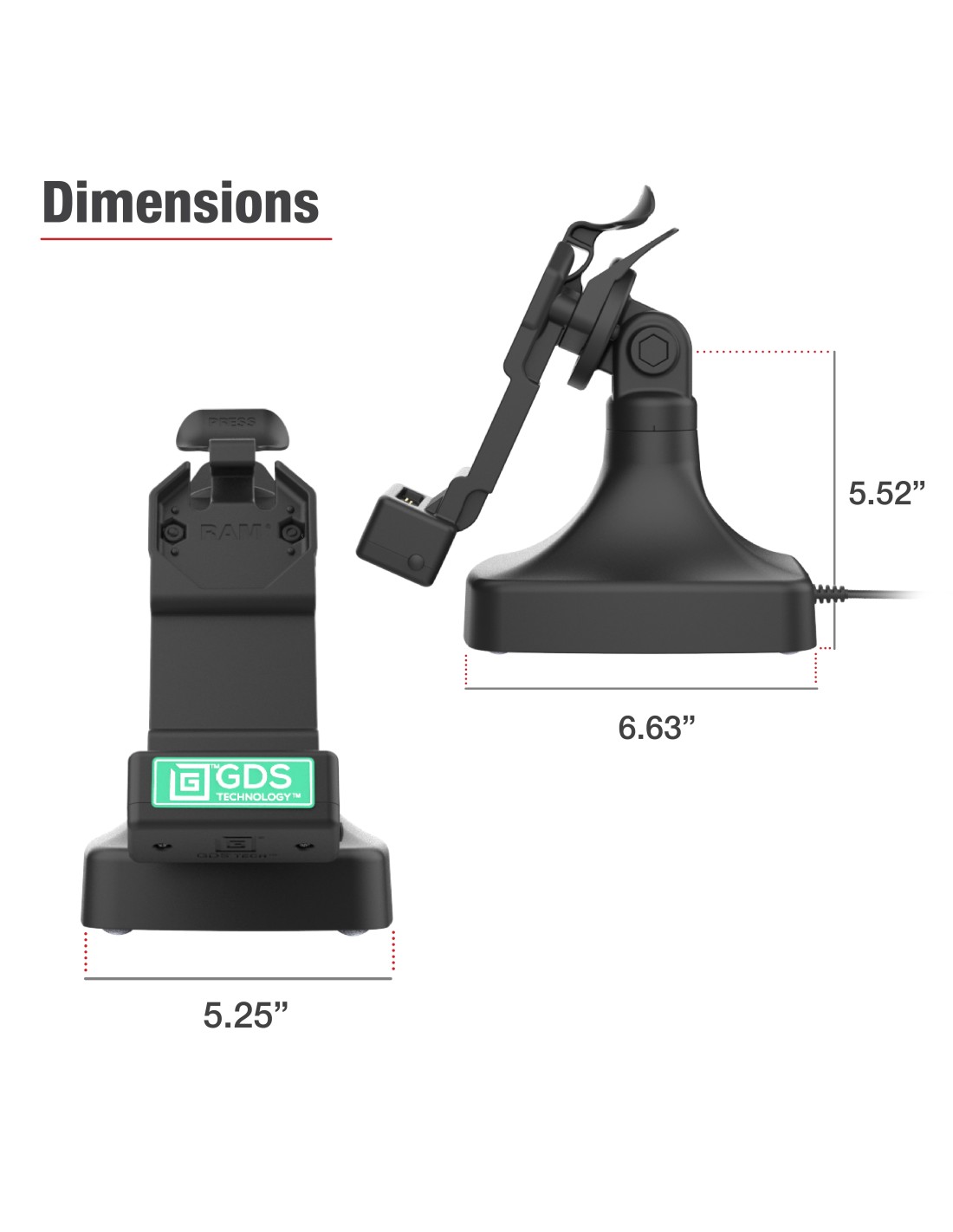 The GDS Uni-Conn Tilt & Swivel Dock with USB-C (RAM-GDS-DOCK-D14-U1C) is a free-standing, powered dock for devices enclosed in an IntelliSkin Next Gen, IntelliSkin Hard Case, or standard IntelliSkin Thin-Case with a GDS Uni-Conn adapter. This solution can swivel 180 degrees and allows devices to tilt 180 degrees, ideal for customer-centric industries like retail, hospitality, food service, and more. Power is provided to the pogo pins integrated into the GDS Uni-Conn dock via USB-C connection. This dock features a weighted base and rubber pads that offer theft deterrence and prevent it from sliding around on surfaces. One Dock to Connect Them All Always Protected. Always Connected.