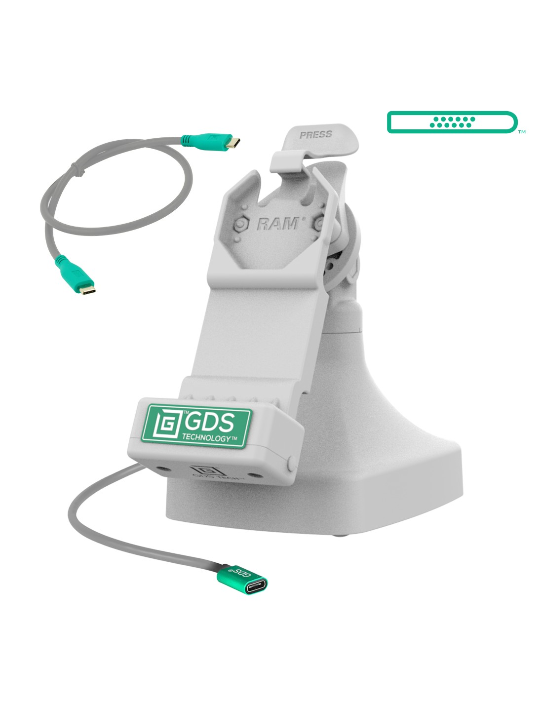 The GDS Uni-Conn Tilt & Swivel Dock with USB-C - Gray (RAM-GDS-DOCK-D14-U1C-GRY) is a free-standing, powered dock for devices enclosed in an IntelliSkin Next Gen, IntelliSkin Hard Case, or standard IntelliSkin Thin-Case with a GDS Uni-Conn adapter. This solution can swivel 180 degrees and allows devices to tilt 180 degrees, ideal for customer-centric industries like retail, hospitality, food service, and more. Power is provided to the pogo pins integrated into the GDS Uni-Conn dock via USB-C connection. This dock features a weighted base and rubber pads that offer theft deterrence and prevent it from sliding around on surfaces. The light gray aesthetic is ideal for sophisticated, bright workplaces. One Dock to Connect Them All Always Protected. Always Connected.