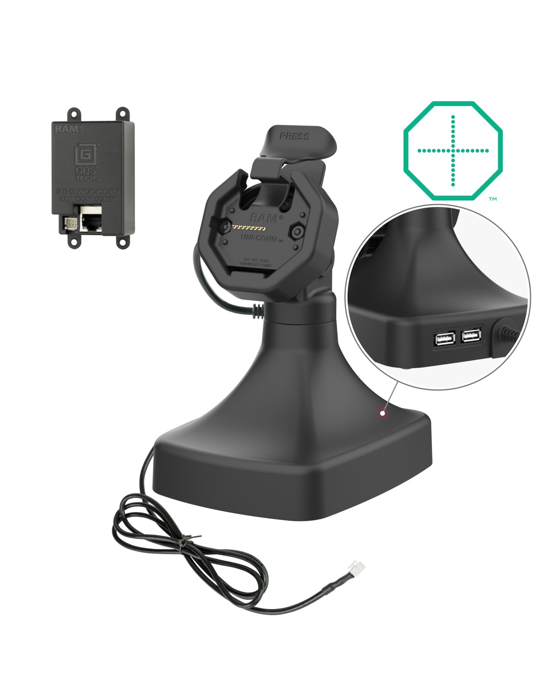 The GDS Uni-Conn Powered Tilt & Swivel Dock with PoE + Data (RAM-GDS-DOCK-D14-U3E-2A) is a free-standing, powered dock for devices enclosed in an IntelliSkin Thin-Case with Rear Pogo Pads. This solution can swivel 180 degrees and allows devices to tilt 180 degrees, ideal for customer-centric industries like retail, hospitality, food service, and more. Easily dock and undock your device with the assistance of the mechanical attachment mechanism. Power over Ethernet (PoE) is provided to the pogo pins integrated into the GDS Uni-Conn adapter via RJ45 connection while the two USB-A ports on the back support up to two input devices like keyboard, mouse, scanner gun, and more. This dock features a weighted base and rubber pads that offer theft deterrence and prevent it from sliding around on surfaces. One Dock to Connect Them All Always Protected. Always Connected.