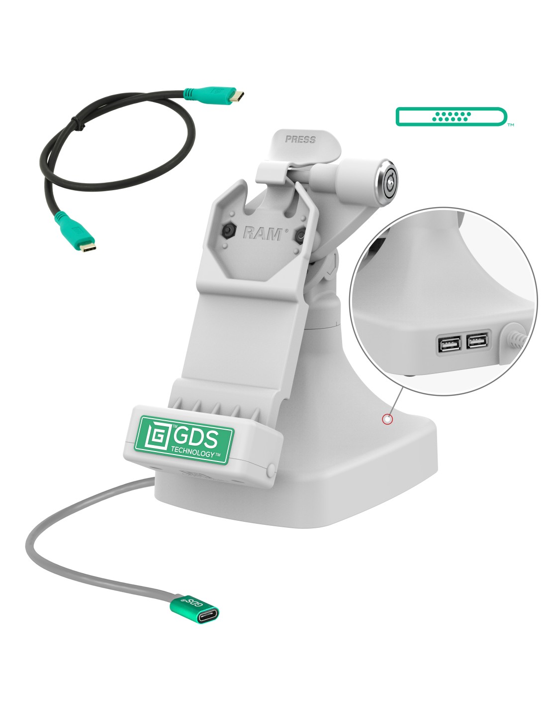 The GDS Uni-Conn Locking Tilt & Swivel Dock with USB-C + Data - Gray (RAM-GDS-DOCKLR-D14-U1C-2A-GRY) is a free-standing, powered dock for devices enclosed in an IntelliSkin Next Gen, IntelliSkin Hard Case, or standard IntelliSkin Thin-Case with a GDS Uni-Conn adapter. This solution can swivel 180 degrees and allows devices to tilt 180 degrees, which is ideal for customer-centric industries like retail, hospitality, food service, and more. Power is provided to the pogo pins integrated into the GDS Uni-Conn dock via USB-C connection while the two USB-A ports on the back support up to two input devices like keyboard, mouse, scanner gun, and more. This dock features a weighted base and rubber pads that provide theft deterrence and prevent it from sliding around on surfaces. Keep your device safe in high-traffic environments with the key lock, integrated to provide additional theft deterrence. The light gray aesthetic is ideal for sophisticated, bright workplaces. One Dock to Connect Them All Always Protected. Always Connected.