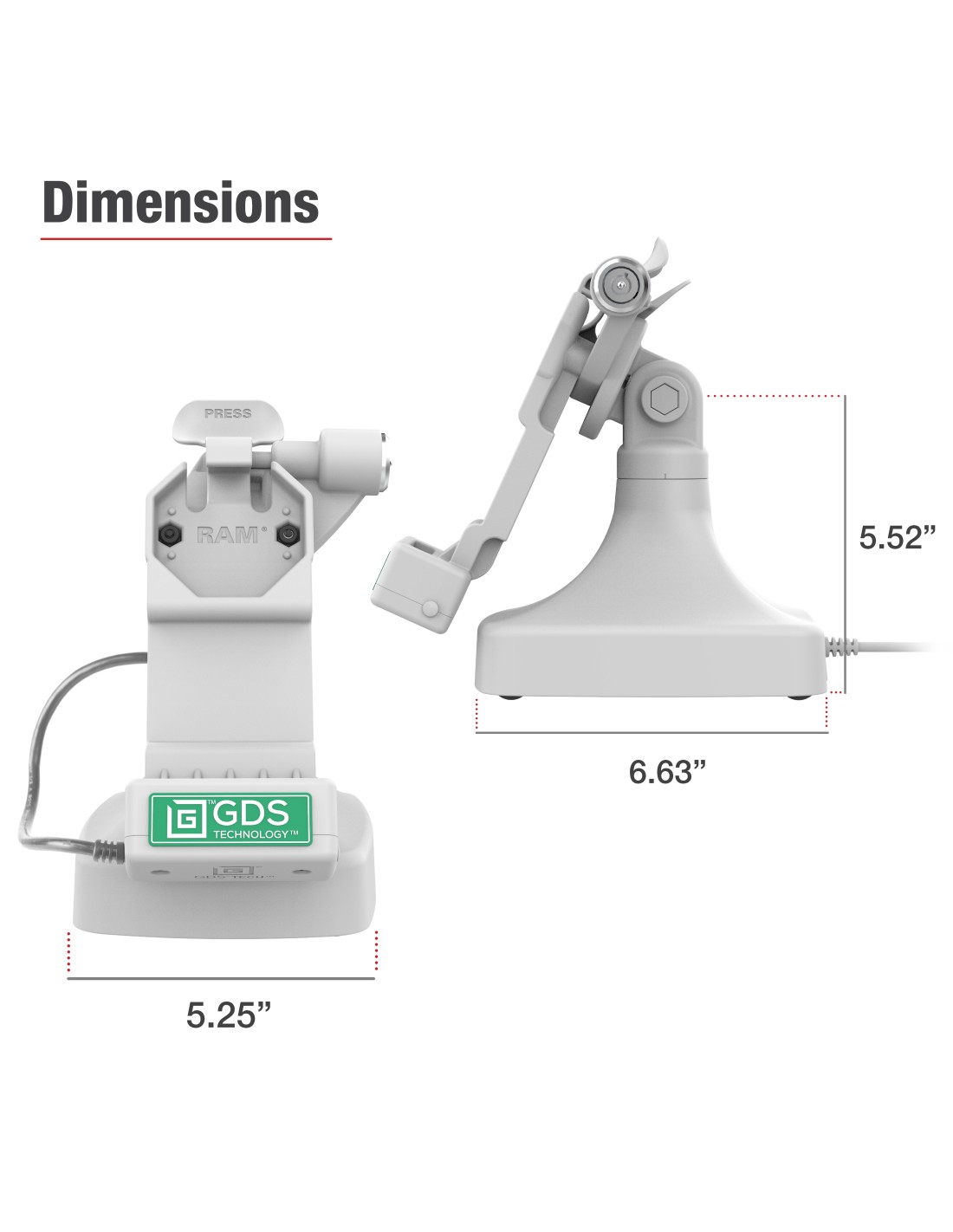 The GDS Uni-Conn Locking Tilt & Swivel Dock with PoE + Data (RAM-GDS-DOCKLR-D14-U1E-2A) is a free-standing, powered dock for devices enclosed in an IntelliSkin Next Gen, IntelliSkin Hard Case, or standard IntelliSkin Thin-Case with a GDS Uni-Conn adapter. This solution can swivel 180 degrees and allows devices to tilt 180 degrees, which is ideal for customer-centric industries like retail, hospitality, food service, and more. Power over Ethernet (PoE) is provided to the pogo pins integrated into the GDS Uni-Conn dock via RJ45 connection while the two USB-A ports on the back support up to two input devices like keyboard, mouse, scanner gun, and more. This dock features a weighted base and rubber pads that offer theft deterrence and prevent it from sliding around on surfaces. Keep your device safe in high-traffic environments with the key lock, integrated to provide additional theft deterrence. The light gray aesthetic is ideal for sophisticated, bright workplaces. One Dock to Connect Them All Always Protected. Always Connected.