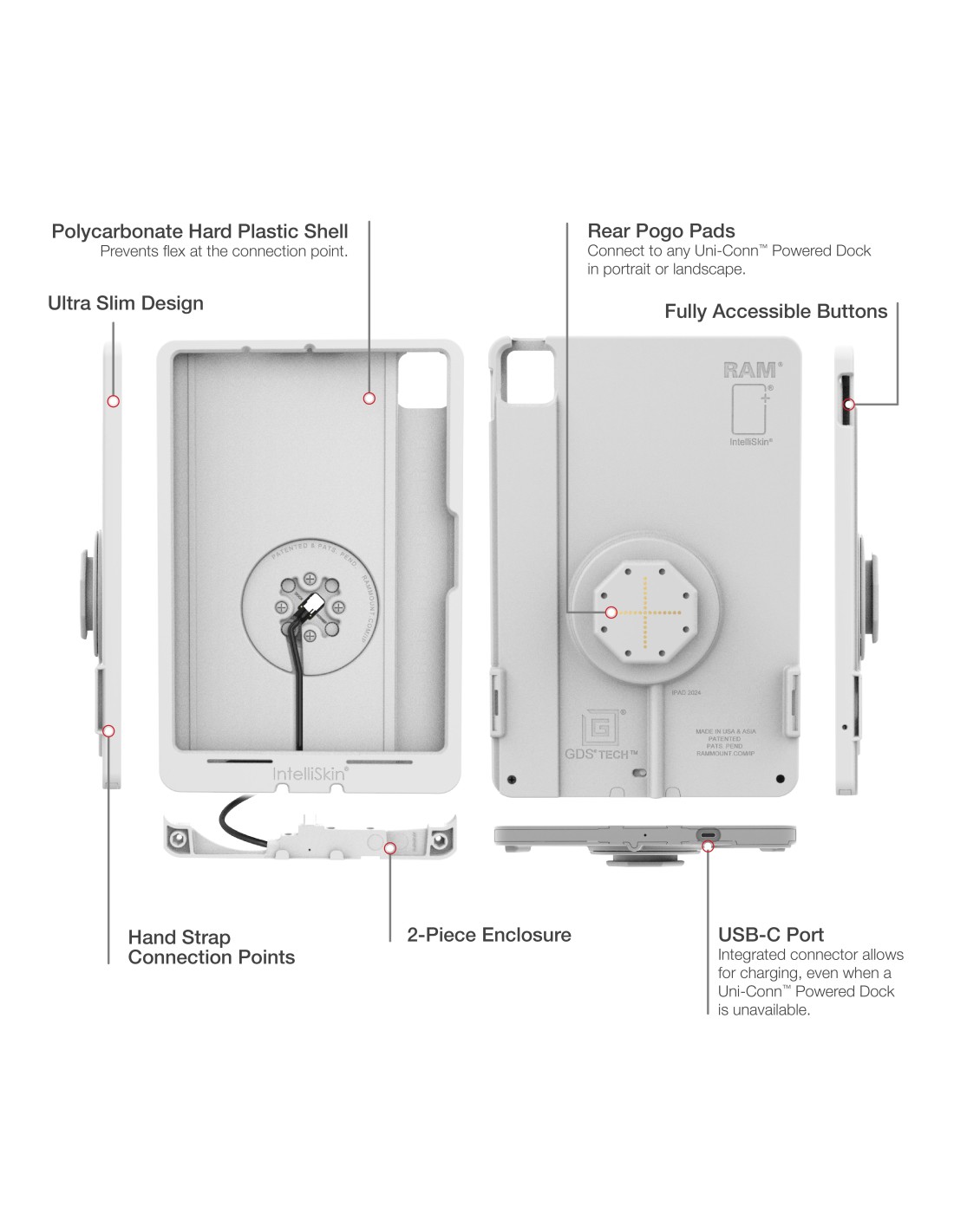 The IntelliSkin Thin-Case for iPad Pro 11 (M4 & M5) (Rear Pogo Pads) - Gray (RAM-GDS-SKIN-AP45-M4-TCB-GRY) is a low-profile, two-piece device enclosure designed for the GDS Uni-Conn docking platform. The GDS connection style integrates a USB-C connector that routes through the case to the pogo pads integrated into the GDS Uni-Conn adapter. The robust polycarbonate shell protects your device from daily wear and tear while the complete enclosure makes it difficult for unauthorized users to access the tablet, providing additional peace of mind for tablets mounted in high-traffic environments. The flat, ruggedized pogo pad contacts are made for repetitive docking to protect the device's port and collect less dirt making them easier to clean. An integrated USB Type-C connector at the bottom of the case allows for device charging even when you don't have a GDS Powered Uni-Conn Dock available. The IntelliSkin Thin-Case for the Apple iPad Pro 11 (M4 & M5) is only compatible with GDS Powered Uni-Conn docks, easily identified by the GDS Powered Uni-Conn Adapter emblem. The light gray aesthetic is ideal for sophisticated, bright workplaces in industries such as retail, medical, and more. One Dock to Connect Them All. Always Protected. Always Connected.