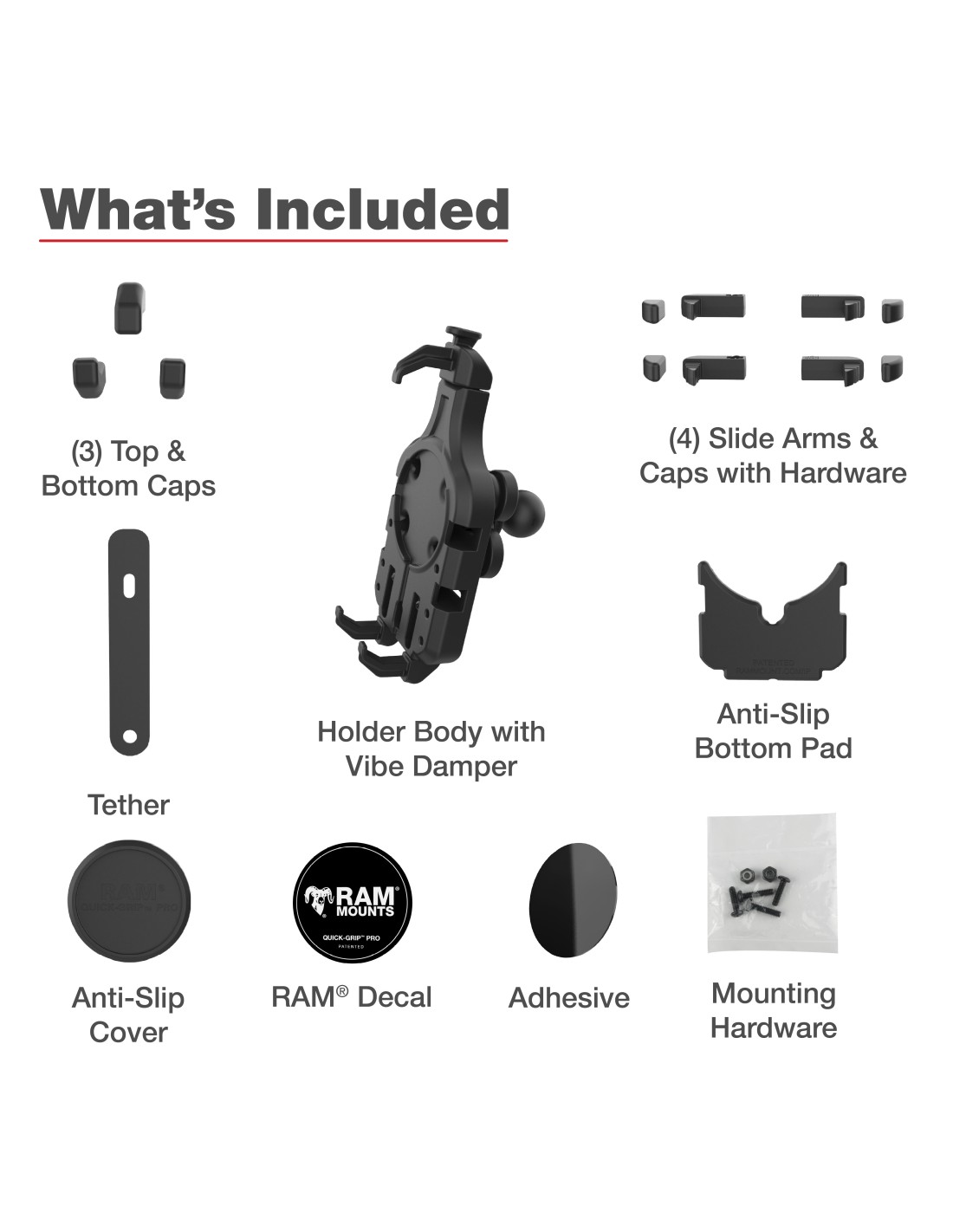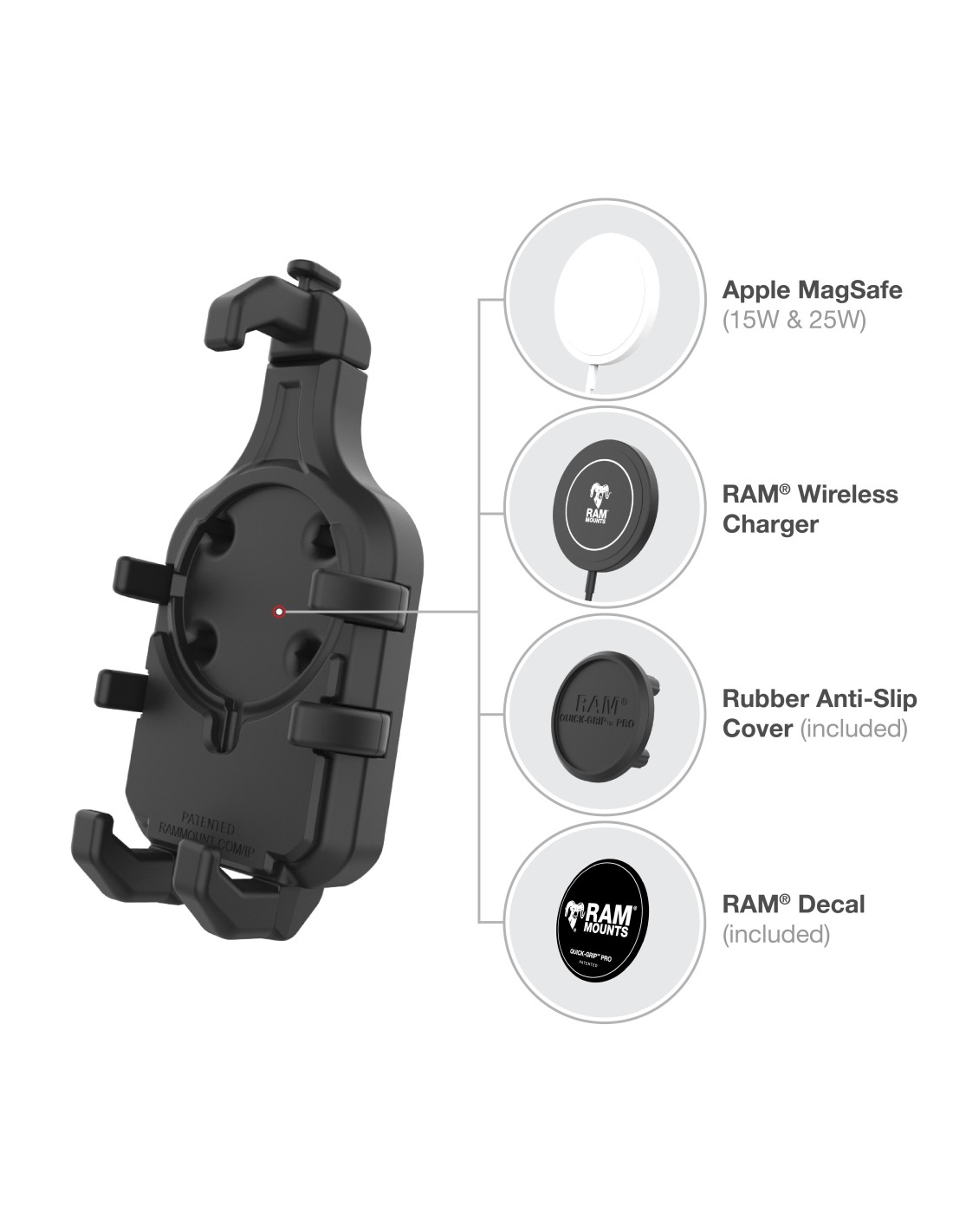 The RAM Quick-Grip Pro Phone Holder with Ball & Vibration Damper (RAM-HOL-PD5BVU) is the next evolution of the RAM Quick-Grip series with an integrated vibration damper. Re-designed with a new, sleek look and integrated rubber side arms to provide a secure, no-slip hold on your phone. This phone holder features an integrated cavity for an Apple Magsafe puck, allowing you to turn the phone holder into a wireless charging solution. Not interested in charging? No problem! The included anti-slip cover ensures a flush fit when the Apple MagSafe puck is not installed. The RAM Quick-Grip Pro features a spring-loaded design that allows easy one-handed insertion and removal of your phone. The adjustable side arms ensure that your phone will remain secured in the holder without blocking any ports or buttons. Complete the solution by building your mountthis holder is RAM Compatible and includes a B size pin-lock ball. RAM recommends installing the provided device tether when this holder is used in a vehicle with an open cockpit. It is important to verify the dimensions of your handheld device with its case, sleeve, or skin when determining the overall size.