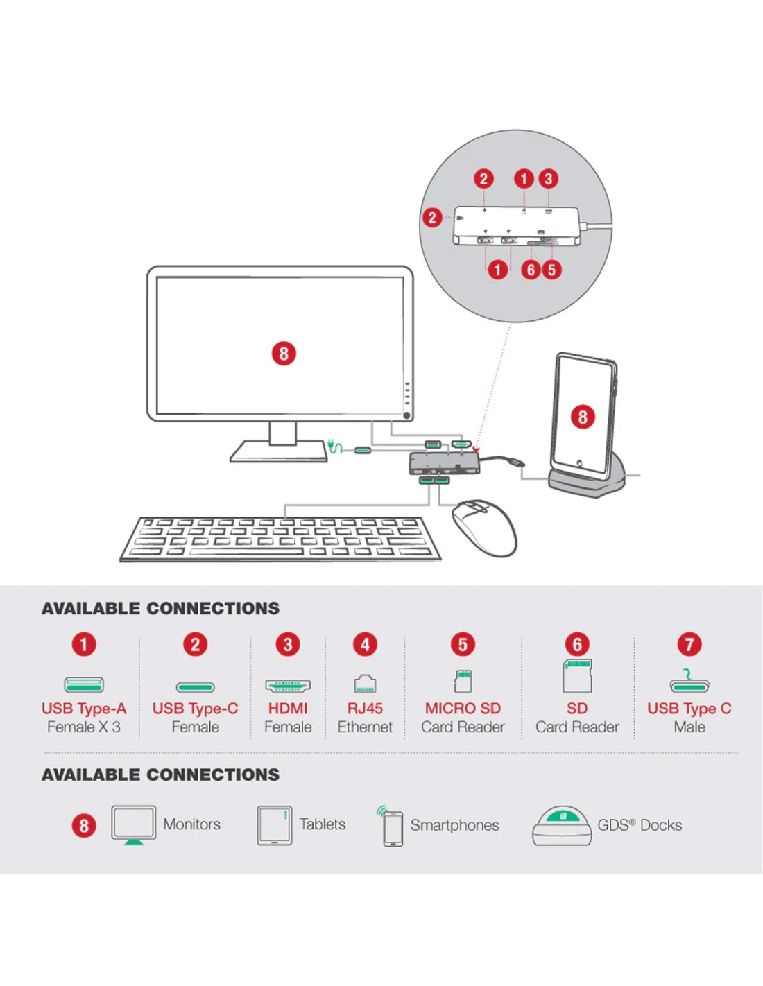 - Easily connect peripherals to your device using 4x USB-A ports, 1x HDMI, & 1x USB-C