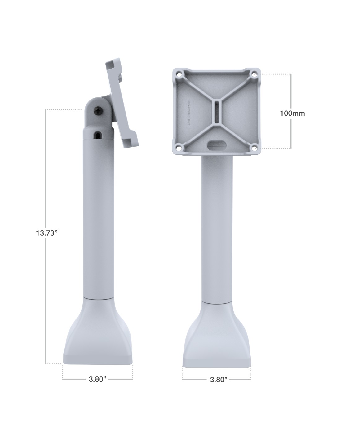 The RAM 14" Pedestal Mount with 100mm & 75mm VESA & Cable Routing - Gray (RAP-D11H-14-V100-GRY) is a free-standing, 14-inch pedestal that allows you to mount any RAM powered dock or passive holder to create a workstation that maintains the mobility of your tablet. Designed for flexibility and stability, this solution features a 180-degree swivel base and 180-degree device tilt, allowing for optimal viewing, positioning, and screen-sharing with co-workers or customers. Ideal for retail, hospitality, food service, and other point-of-sale or customer-interaction environments, this mount supports VESA 75mm and 100mm patterns for broad device compatibility alongside RAM docks and holders. This mount features cut-outs for cable management and routing from devices, down through the pedestal, and out of the bottom for a clean workspace. The drill-down base ensures a secure, fixed installationmaking it perfect for high-traffic or semi-permanent setups. Made in a light gray color, the mount blends seamlessly into clean, modern, and aesthetic environments where subtlety and professional appearance matter.