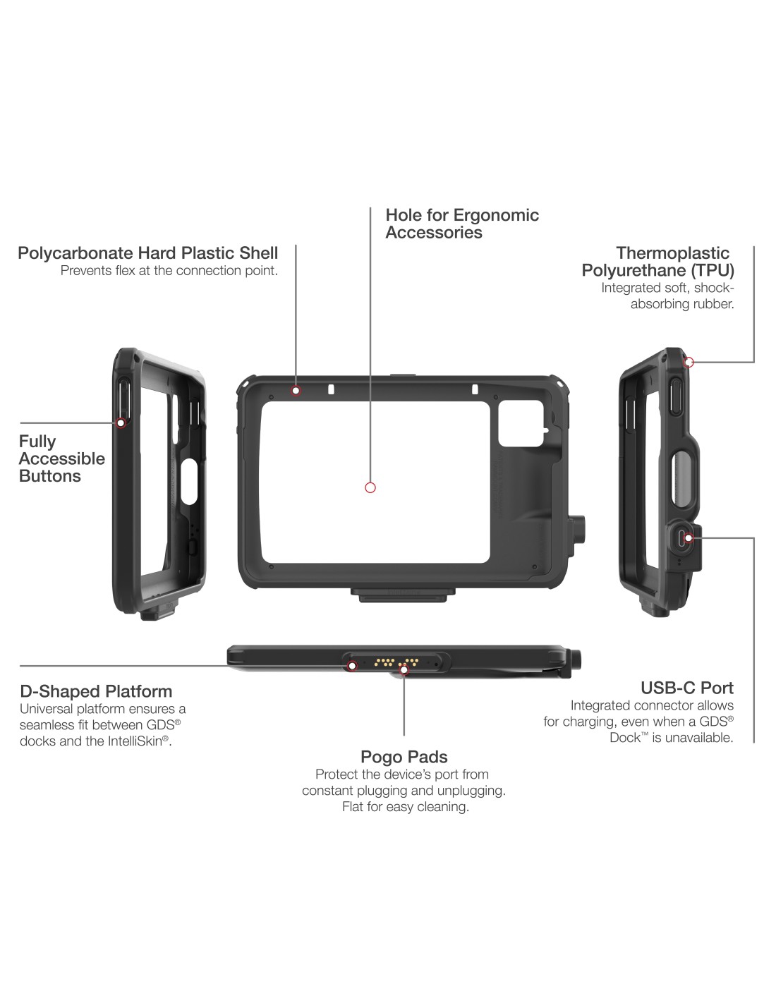 - IntelliSkin® features an overmolded USB-C connector that transforms the connection into flat pogo pad docking contacts, ruggedizing and standardizing devices across operations while enabling both charging and data synchronization when used with GDS® DocksT