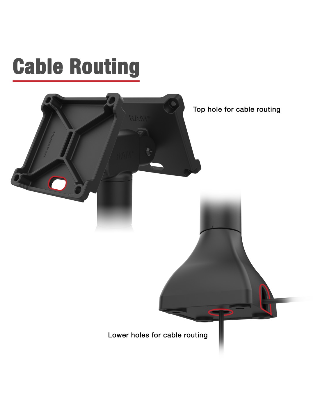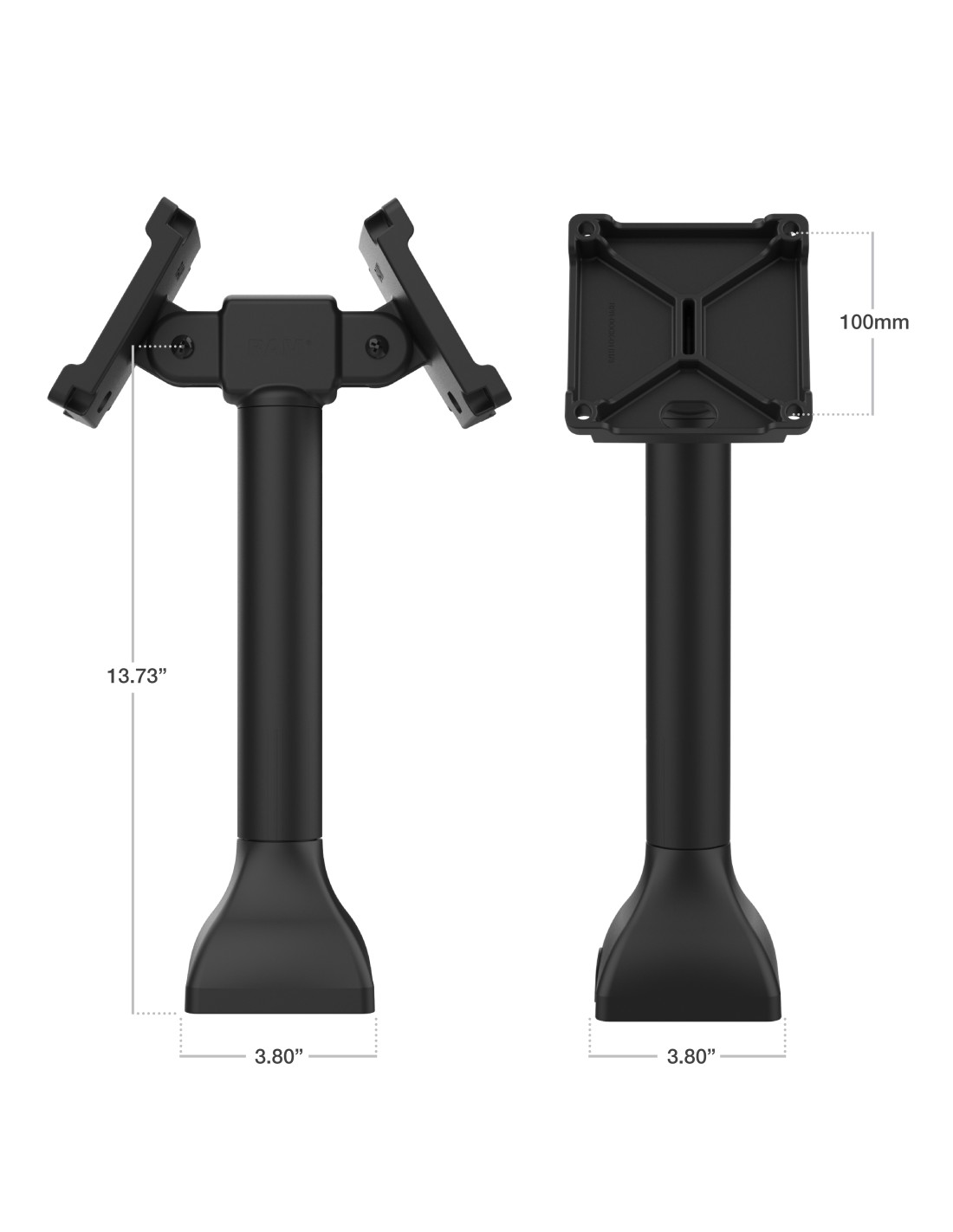 The RAM 14" Pedestal Mount with Dual 100mm VESA Adapters (RAP-D11H2-14-V100) provides a sturdy and streamlined way to mount two displays or devices back-to-back on a single pedestal. Each head includes a 100mm VESA plate with integrated cable management cutouts, allowing power and data cables to route neatly through the pedestal and out the base for a clean, professional workspace. With 180 tilt adjustment on each head, users can easily achieve optimal viewing angleswhether the setup is for shared workstations, control panels, or fleet monitoring environments. The drill-down base delivers a secure, fixed installation ideal for high-traffic or semi-permanent setups. Durable, adaptable, and built for precision alignment, this dual-mount solution brings both functionality and visual organization to any business space.