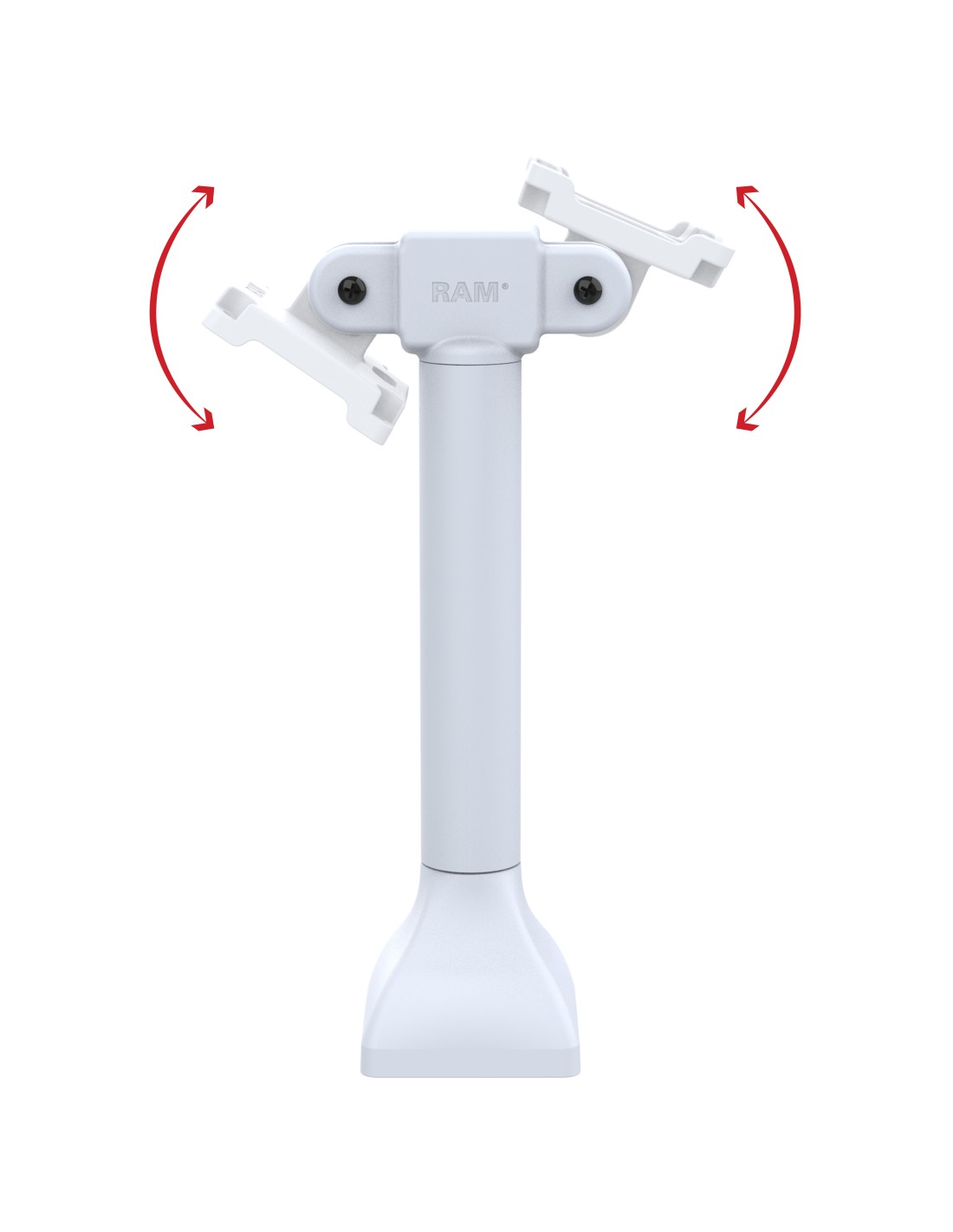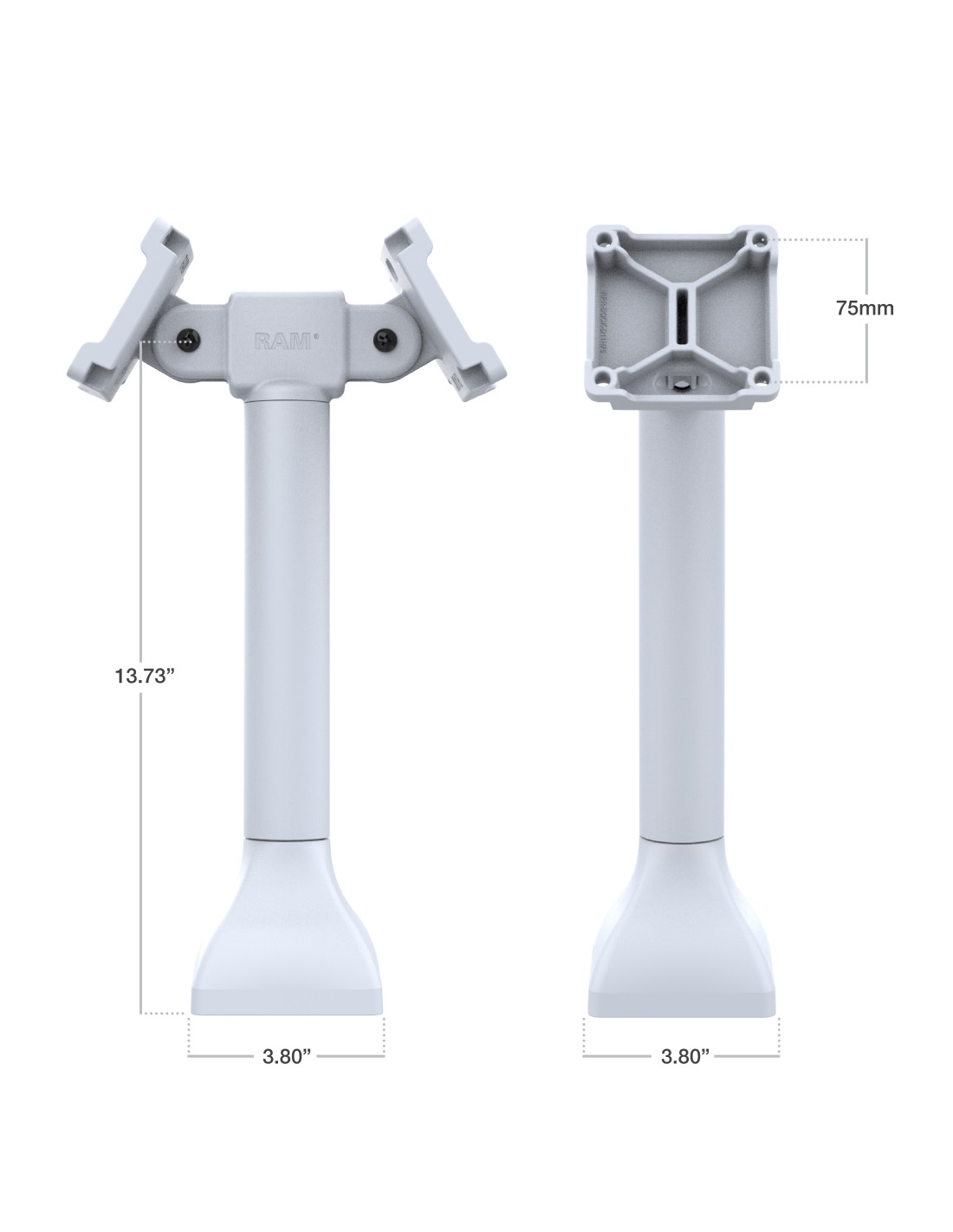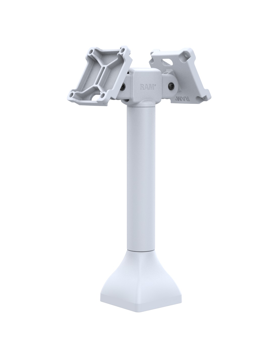The RAM 14" Pedestal Mount with Dual 75mm VESA Adapters - Gray (RAP-D11H2-14-V75-GRY) provides a sturdy and streamlined way to mount two displays or devices back-to-back on a single pedestal. Each head includes a 75mm VESA plate with integrated cable management cutouts, allowing power and data cables to route neatly through the pedestal and out the base for a clean, professional workspace. With 180 tilt adjustment on each head, users can easily achieve optimal viewing angleswhether the setup is for shared workstations, control panels, or fleet monitoring environments. The drill-down base delivers a secure, fixed installation ideal for high-traffic or semi-permanent setups. Durable, adaptable, and built for precision alignment, this dual-mount solution brings both functionality and visual organization to any business space. Made in a light gray color, the mount blends seamlessly into clean, modern, and aesthetic environments where subtlety and professional appearance matter.