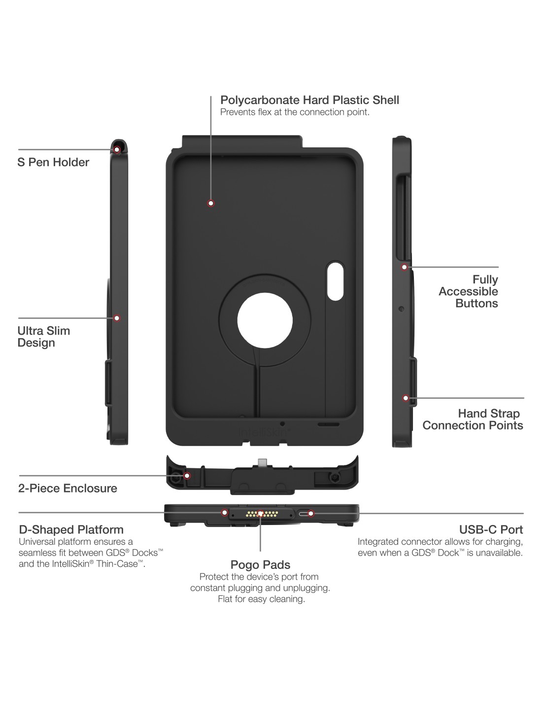 The IntelliSkin Thin-Case for Samsung Tab Active5 Pro (RAM-GDS-SKIN-SAM100-TCD) is a low-profile, two-piece device enclosure designed for the GDS Uni-Conn docking platform. The case features the Distinctive D-Shape integrated USB-C connector with external pogo pads. The robust polycarbonate shell protects your device from daily wear and tear while the complete enclosure makes it difficult for unauthorized users to access the tablet, providing additional peace of mind for tablets mounted in high-traffic environments. The flat, ruggedized pogo pad contacts are made for repetitive docking to protect the device's port and collect less dirt making them easier to clean. An integrated USB Type-C connector at the bottom of the case allows for device charging even when you dont have a GDS Dock available. Always Protected. Always Connected.