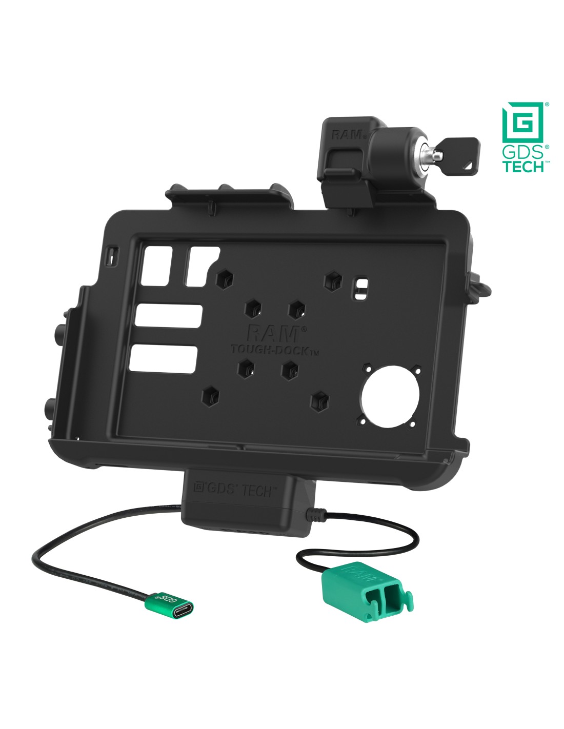 The Locking GDS Thin-Dock + Dual USB for Zebra ET401 10" with IntelliSkin (RAM-GDS-DOCKL-ZE47PD2U) delivers a low-profile, 2.45"-deep design reinforced with a durable metal plate, ideal for applications where space is limited. This vehicle dock is purpose-built for the Zebra ET401, ET40, and ET45 10" enterprise tablets when used with an IntelliSkin protective sleeve, ensuring a reliable, long-lasting mounting and charging solution. Engineered for efficiency, the Thin-Dock keeps your tablet powered through pogo pin contacts while docked, with power supplied via the docks USB Type-C connector. Connect up to two peripheral devices such as a mouse, keyboard, or printer using the peripheral dual USB-A connector. The design also maintains access to the tablets side scanning function, making it a strong fit for field service, warehousing, retail, transportation, and other data-capture environments. Because of its compact footprint, this dock does not support add-ons like the Zebra Expansion Back or PowerPack Battery. For mounting flexibility, the dock is compatible with both RAM C and D size 4-hole AMPS pattern bases, ideal for pairing with a double socket arm to complete your vehicle or workstation setup. This dock also features integrated attachment points for the RAM Vent-Temp, a temperature control accessory, and the RAM NFC Extender. Always Protected. Always Connected.