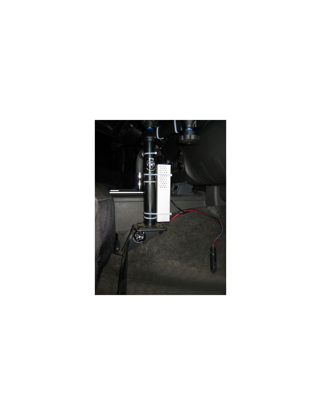 - Custom laptop vehicle mount installs using passenger seat bolts; no drilling required
