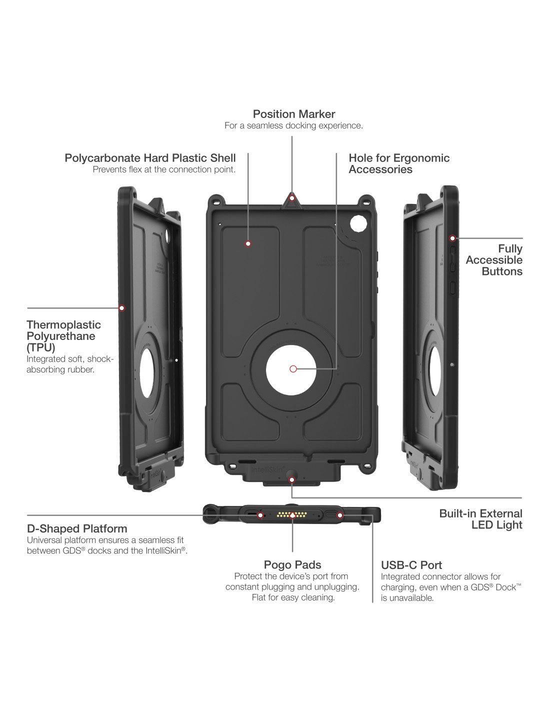 - Enhanced durability protecting the device's USB-C port by converting the connection point to ruggedized pogo pad docking contacts for charging and data sync capabilities