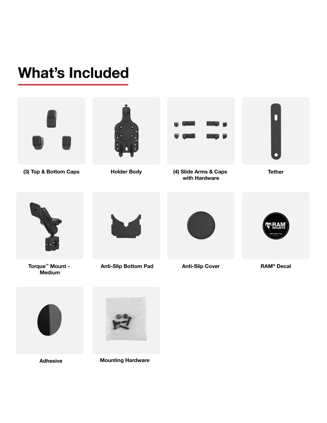 The RAM Quick-Grip Pro Phone Mount with Medium Torque Base - Medium (RAM-B-408-75-1-PD5U) is a kit that installs to rails and features the next evolution in the RAM Quick-Grip phone holder series. The phone holder is re-designed with a new, sleek look and integrated rubber side arms to provide a secure, no-slip hold on your phone. It features an integrated cavity compatible with the RAM Qi2 Wireless Charger or the Apple MagSafe puck, allowing you to turn the phone holder into a wireless charging solution. Not interested in charging? No problem! The included anti-slip cover ensures a flush fit when nothing is installed. The RAM Quick-Grip Pro features a spring-loaded design that allows easy one-handed insertion and removal of your phone. The adjustable side arms ensure that your phone will remain secured in the holder without blocking any ports or buttons. The RAM Torque mounting base is compatible with rails 3/4 to 1 in diameter. Sizing inserts are included to provide a tight fit while also protecting the mounting surface. The RAM Torque mounting base also includes nylon-insert lock nuts to prevent loosening in high vibration environments. The RAM ball and socket system allows for articulation at both ends of the double socket arm creating almost infinite adjustment and perfect viewing angles. RAM recommends installing the provided device tether when this holder is used in a vehicle with an open cockpit. It is important to verify the dimensions of your handheld device with its case, sleeve, or skin when determining the overall size.
