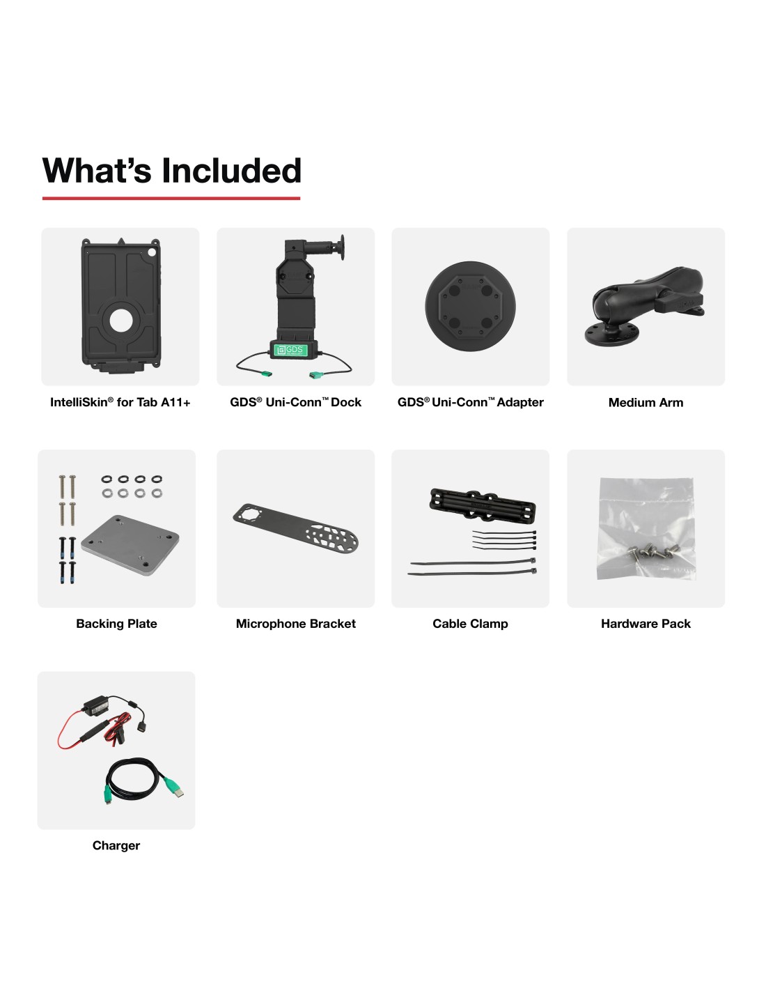 - Bundle includes GDS® Uni-ConnT dock with quick-release button, Uni-ConnT adapter, IntelliSkin® for the Samsung Tab A11+, a microphone bracket, 10-30V hardwire charger with USB-A connector, USB-A male to USB-C male 2.0 entension cable, cable clamp kit, and a double ball mount with backing plate