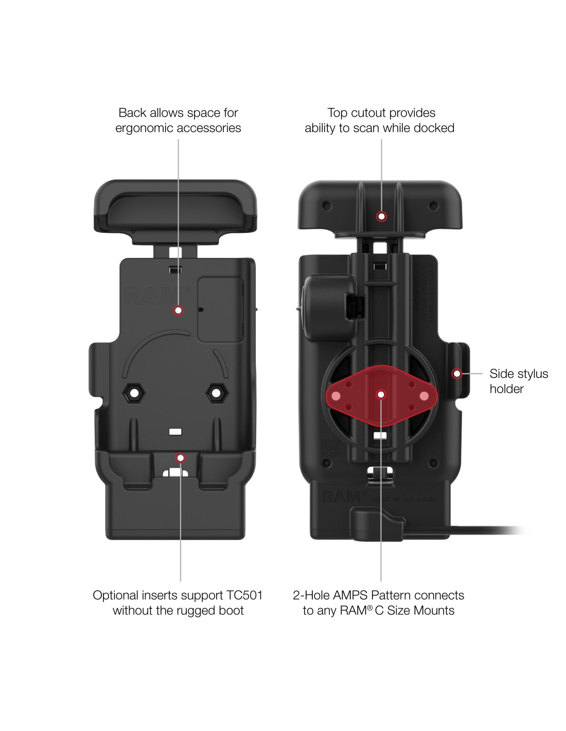The RAM Powered Dock with USB-C for Zebra TC501 (RAM-HOL-ZE41C-2U) is built to enable workflows dependent on data transfer, such as connecting to workstations via Zebra's Workstation Connect. The spring-loaded design allows operators to dock devices quickly and confidently, minimizing fumbling and reducing the risk of USB-C connector damage. The integrated top-cup cutout allows access to buttons, ports, and scanners without removing the device, so productivity never slows down. Complete your mounting solution with confidencethis holder is RAM Compatible and features a 2-hole AMPS pattern for seamless integration with a diamond ball adapter.