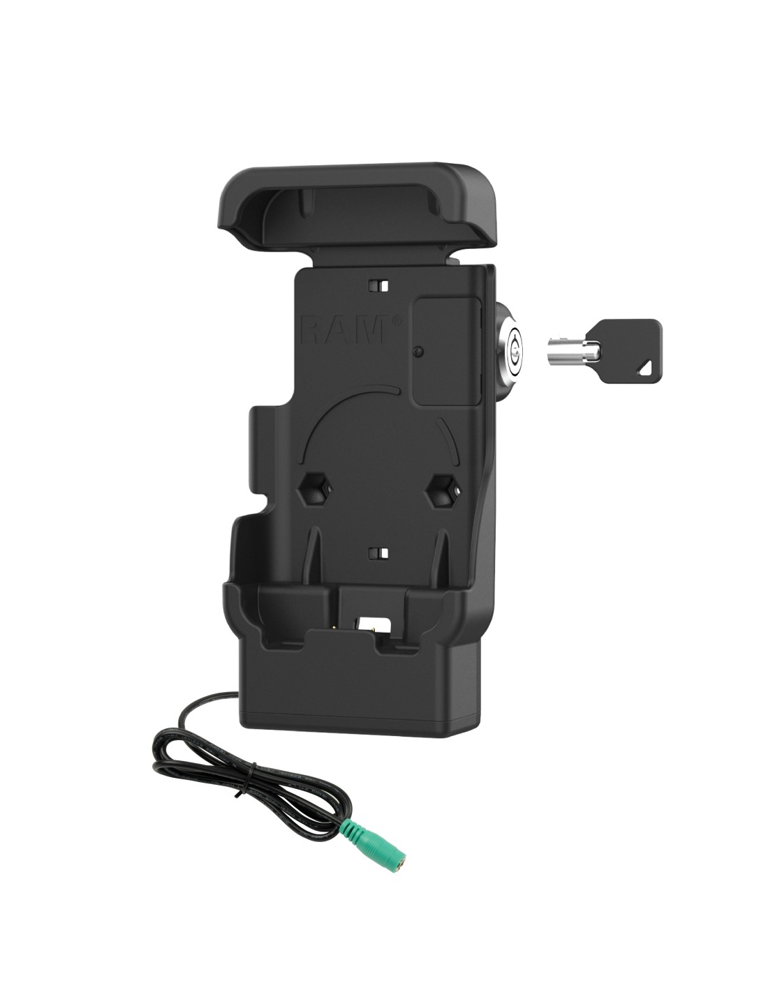 The RAM Locking Powered Dock with Pogo Pins for Zebra TC701 (RAM-HOL-ZE41L-1U) is built to perform in demanding, real-world workflows. By charging through the devices pogo pad docking contacts, the pogo pin design protects the TC701s charge port while enhancing overall durability. A spring-loaded mechanism enables quick, one-handed docking and removal, keeping operators efficient on the move. The integrated top-cup cutout allows access to buttons, ports, and scanners without removing the device, so productivity never slows down. For added security in high-traffic environments, the integrated key lock provides reliable theft deterrence. Complete your mounting solution with confidencethis holder is RAM Compatible and features a 2-hole AMPS pattern for seamless integration with a diamond ball adapter.