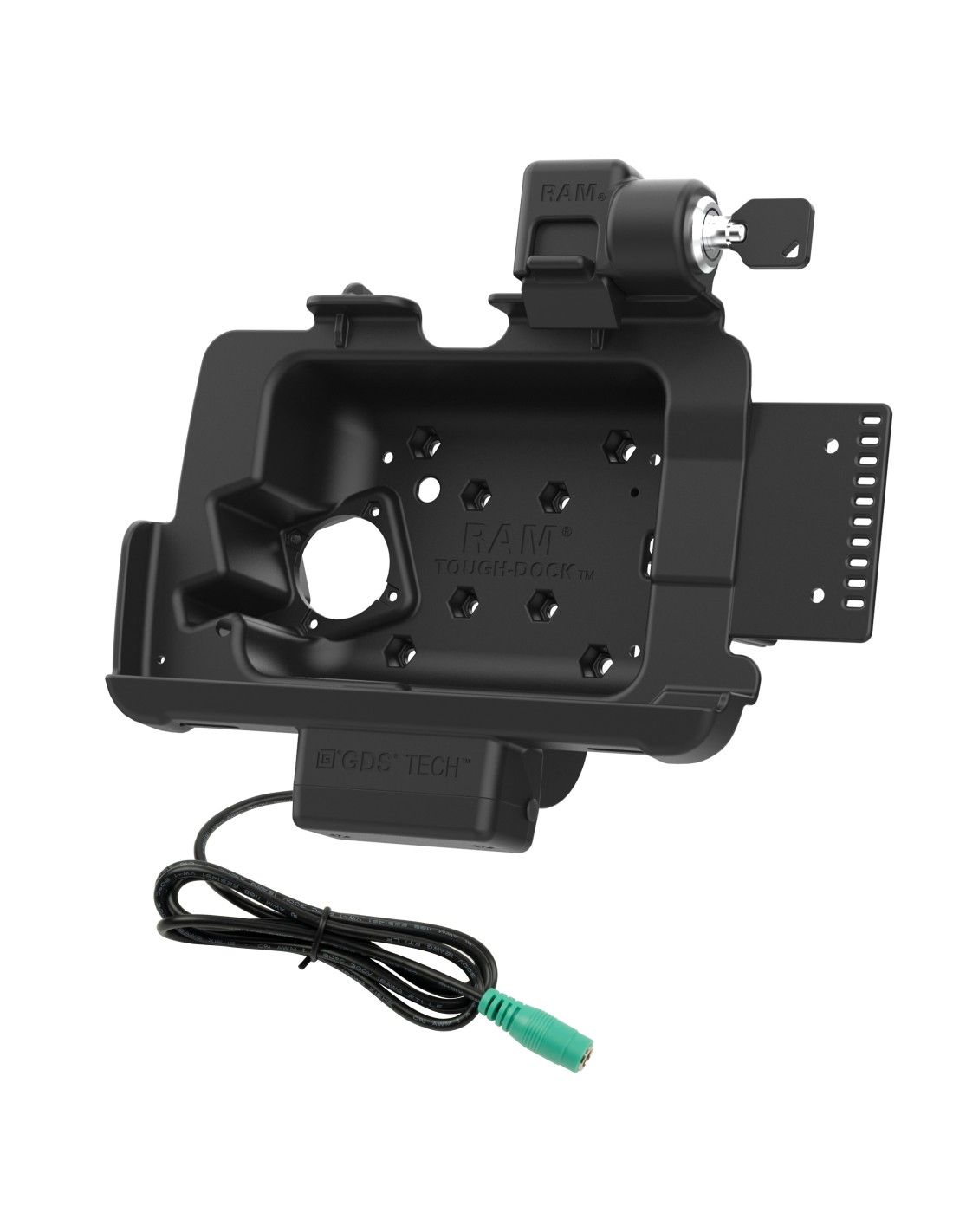 Featuring charging capabilities and a key lock for theft deterrence, the RAM Tough-Dock (RAM-HOL-ZE44PLU) works with the Zebra ET401 with RAM Skin. Power is provided via a 5.5mm DC barrel connector and allows you to keep the device charged through the pogo pin contacts when the device is docked. A single USB Type-A pigtail connector is provided for adding one additional input device. The dock also includes space in the back for tablet add-ons such as the Zebra Expansion Back, PowerPack Battery, and GDS Ergo accessories like the GDS Roto-Mag and GDS Hand-Stand. To mount this dock, pair any C and D size RAM 4-hole AMPS or 75mm x 75mm VESA pattern bases for attaching a double socket arm in order to complete your mounting solution. Take the solution a step further by taking advantage of the built-in 2-hole mounting plate compatible with RAM 2-hole diamond base for additional device mounting such as a phone, scanner, printer, or any other handheld device.