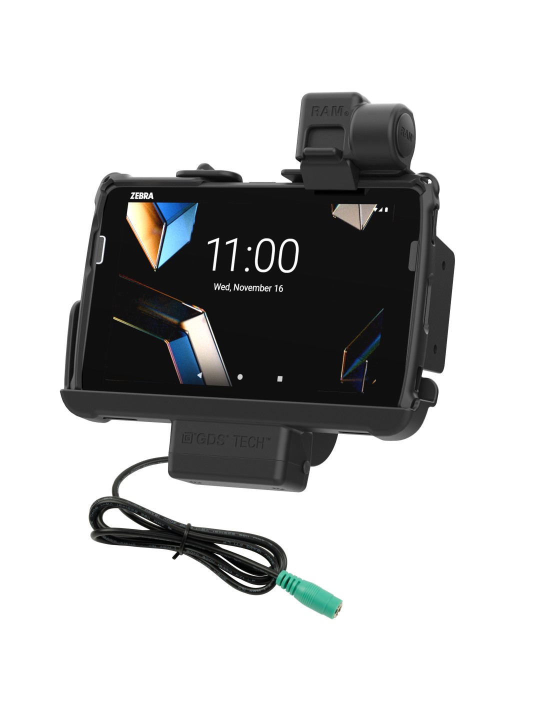 For frequent docking and undocking, this dock works with the Zebra ET401 with RAM Skin. This RAM Tough-Dock (RAM-HOL-ZE44PU) features a top latch design for securing the tablet without wear and tear on the dock itself. Power is provided via a 5.5mm DC barrel connector and allows you to keep the device charged through the pogo pin contacts when the device is docked. The dock also includes space in the back for tablet add-ons such as the Zebra Expansion Back, PowerPack Battery, and GDS Ergo accessories like the GDS Roto-Mag and GDS Hand-Stand. To mount this dock, pair any C and D size RAM 4-hole AMPS or 75mm x 75mm VESA pattern bases for attaching a double socket arm in order to complete your mounting solution. Take the solution a step further by taking advantage of the built-in 2-hole mounting plate compatible with RAM 2-hole diamond base for additional device mounting such as a phone, scanner, printer, or any other handheld device.