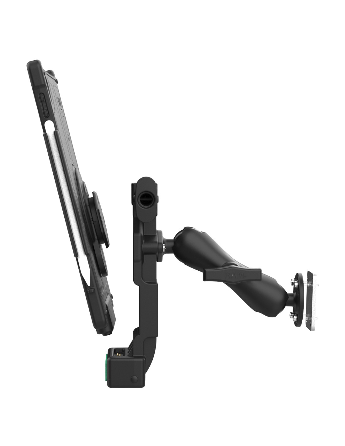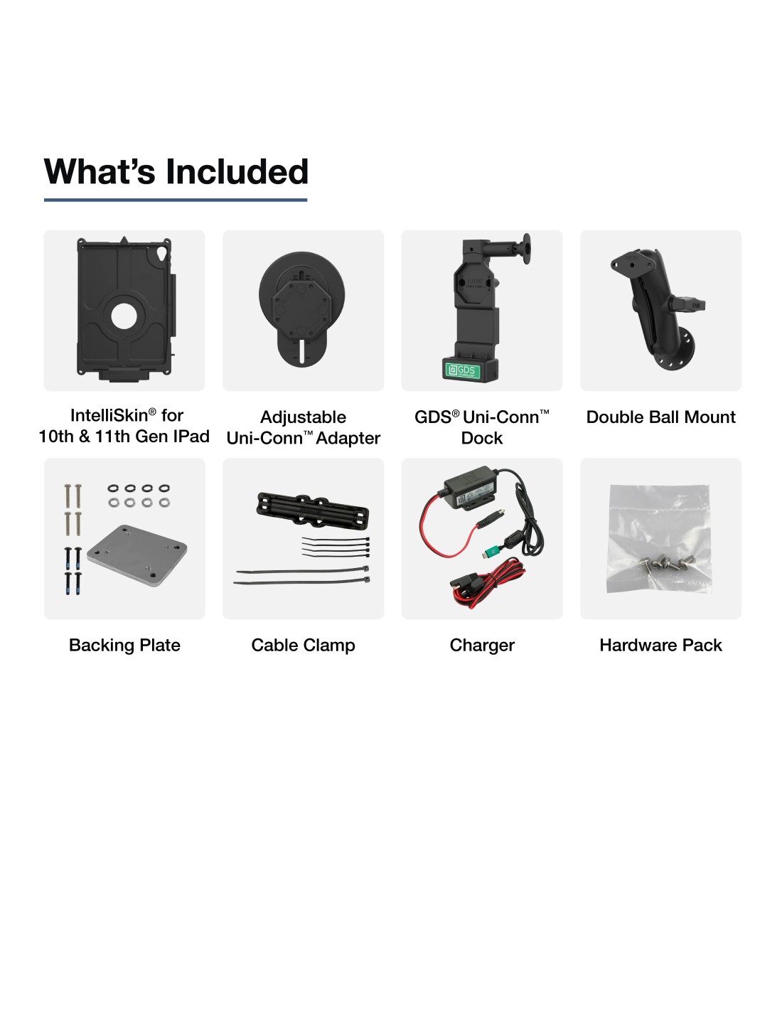 - Bundle includes GDS® Uni-ConnT dock with quick-release button, Uni-ConnT adapter, IntelliSkin® Next Gen for Apple iPad 10th & 11th Gen, C size double ball mount with medium arm, backing plate adapter, 10-30V hardwire charger with USB-C connector, and cable clamp
